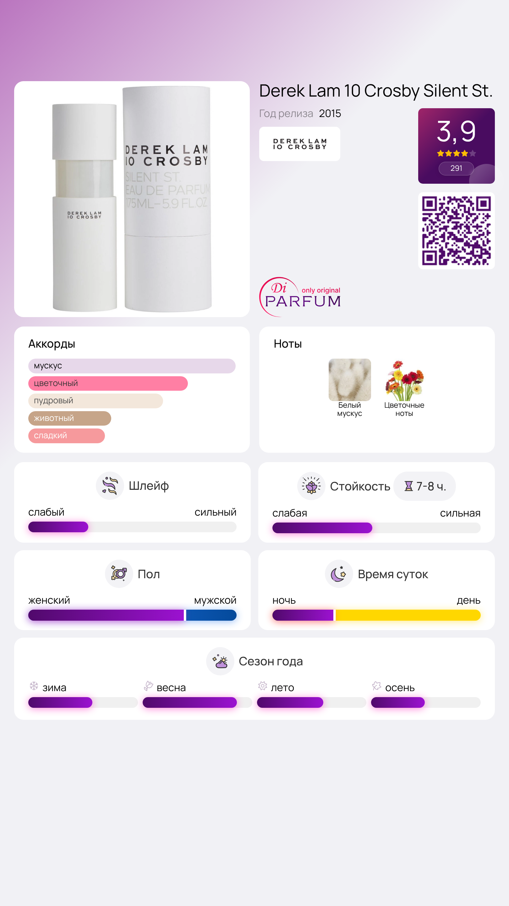 Элегантная цветочно-древесно-мускусная композиция призывает сделать паузу. Этот аромат является «островком» спокойствия и тишины, уберегающим от городской суеты и шума. Именно в такие моменты можно глубже понять себя, осознать важные вещи и увидеть новые горизонты для дальнейшего движения.