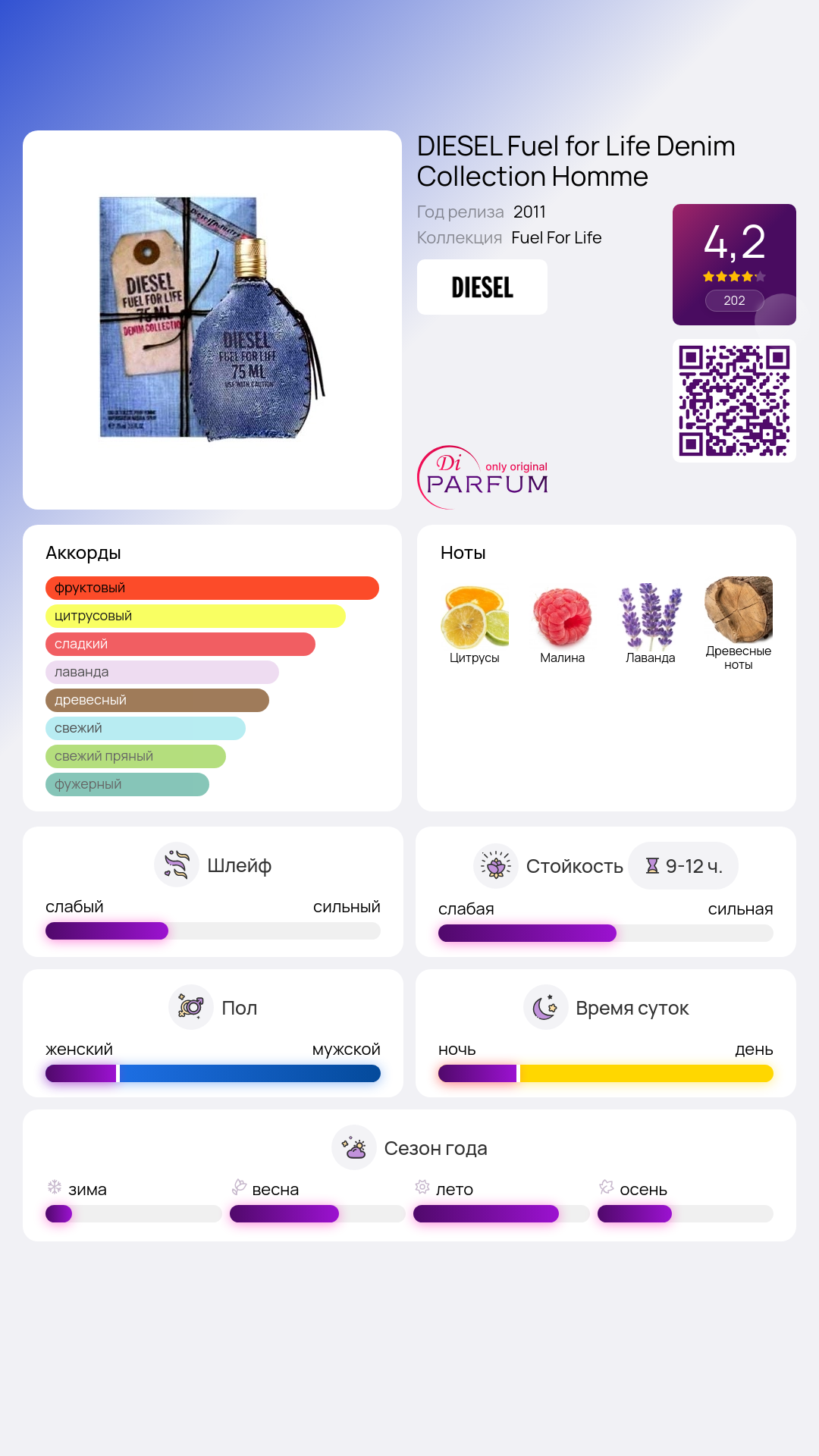 Ароматная композиция для мужчин от Diesel Fuel for Life Denim Collection Homme была выпущена в 2011 году. Этот энергичный и молодежный запах обладает удивительной притягательностью. В его состав входят самые яркие мужские ноты: в шлейфе отлично слышны древесные аккорды, а в начале преимущественно выделяются свежие цитрусовые ноты. В этом освежающем окружении спрятано нежное сердце из лаванды и малины — соблазнительный тандем, который дополнительно очаровывает женщин.