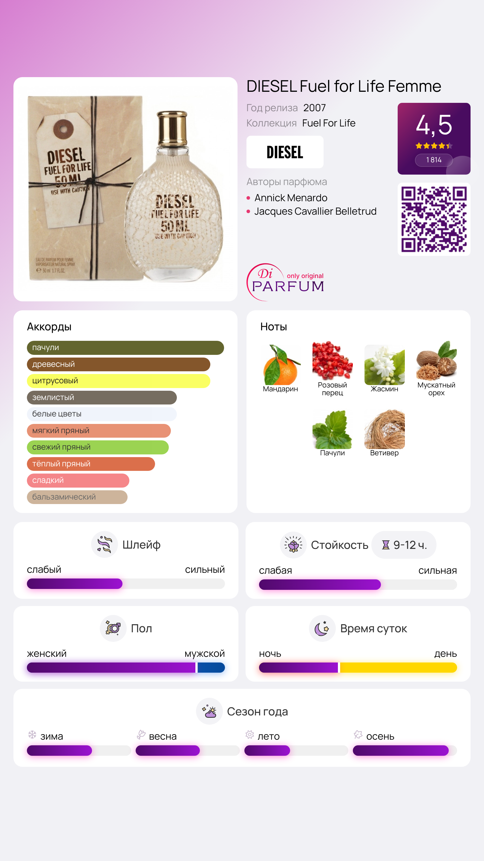 Парфюм Fuel for Life от Diesel пробуждает ощущение приключений. Начальные ноты черной смородины и розового перца плавно переходят в сердца композиции, где царят жасмин и индол. Завершающим штрихом становятся пачули и амбра, придающие аромату невероятную привлекательность.
