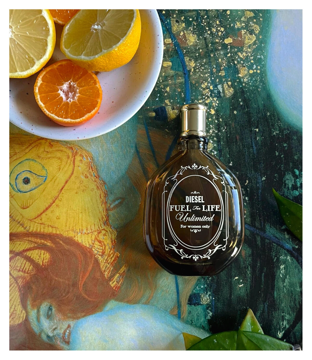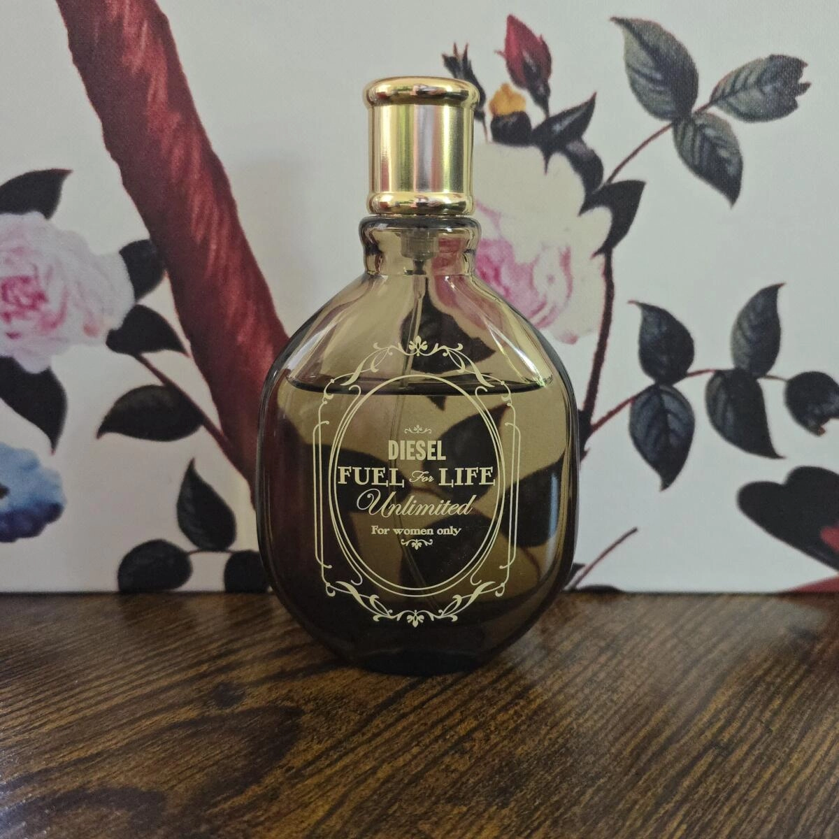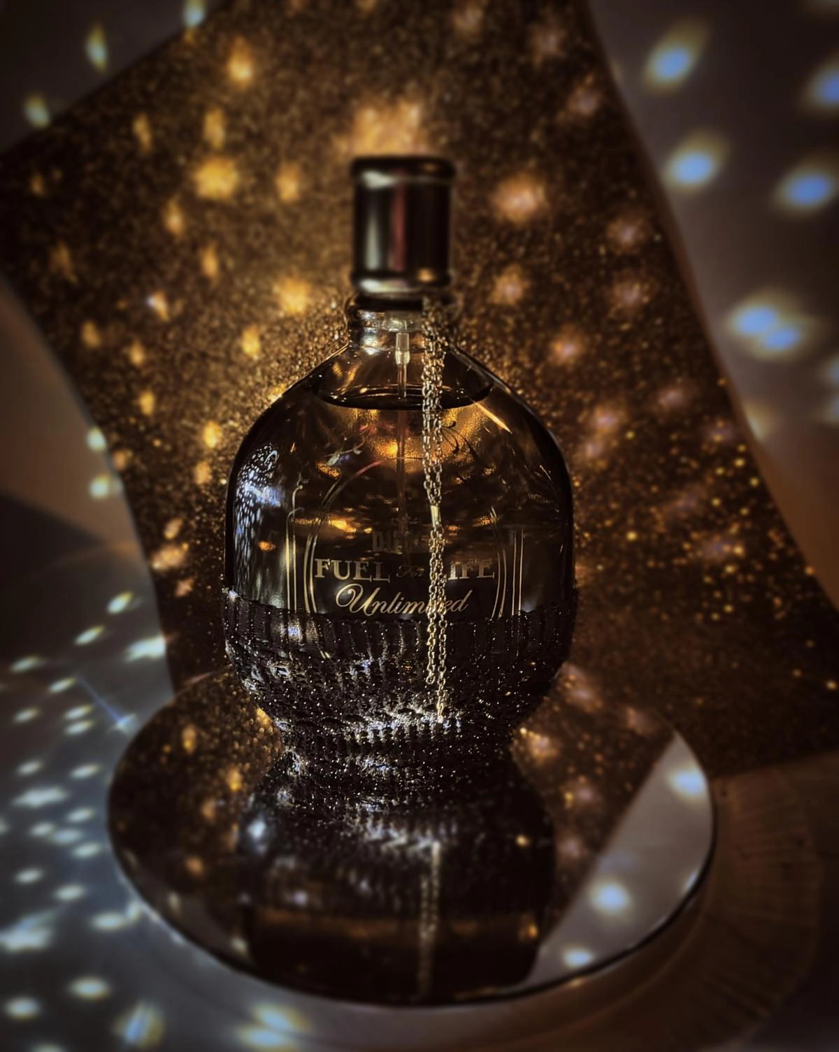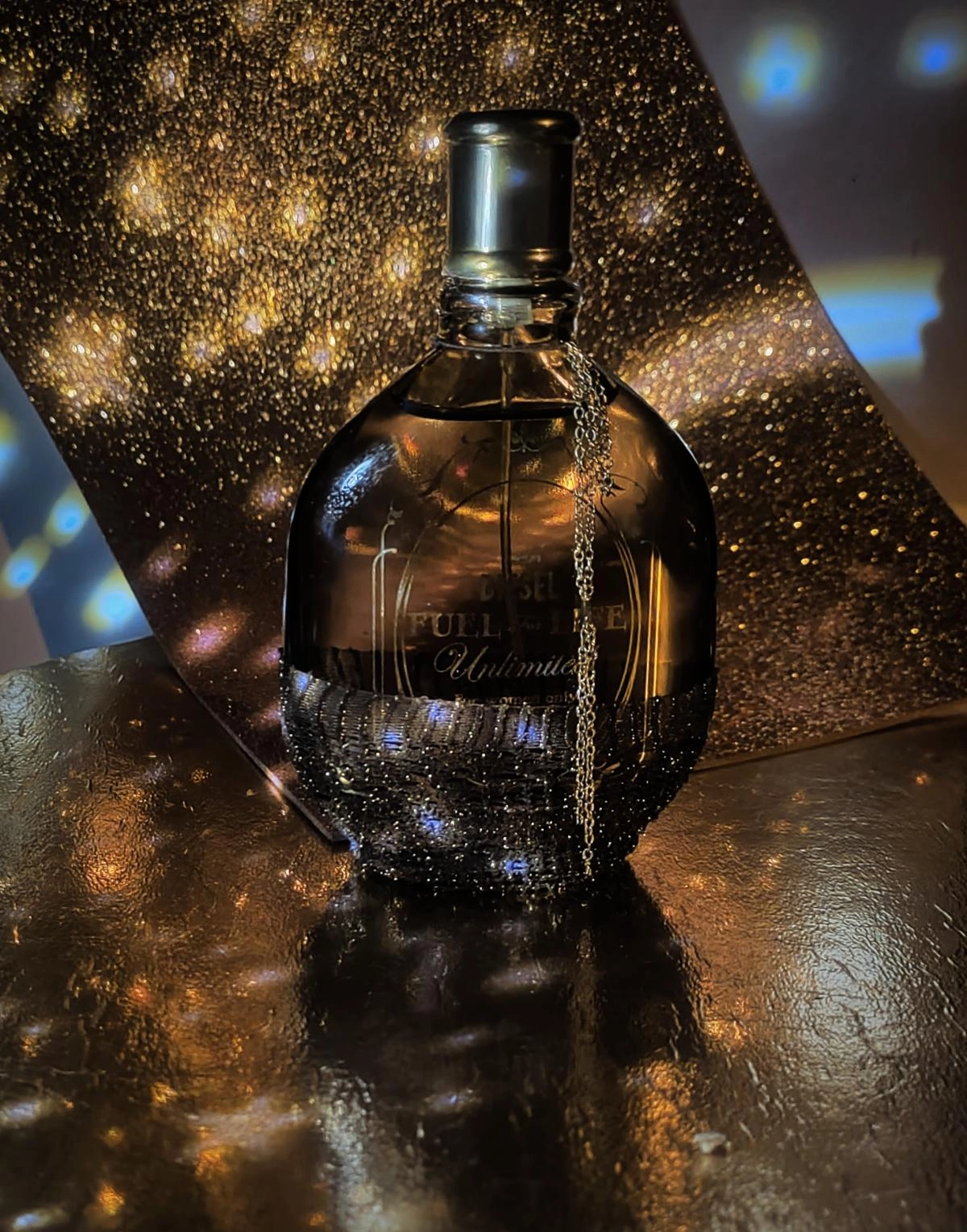 Элегантный флакон Diesel Fuel for Life pour Femme Unlimited, оформленный в виде коричневой фляги с золотой цепочкой и сеткой, создает образ сильной и экстравагантной женщины, отражая ее неповторимый стиль.