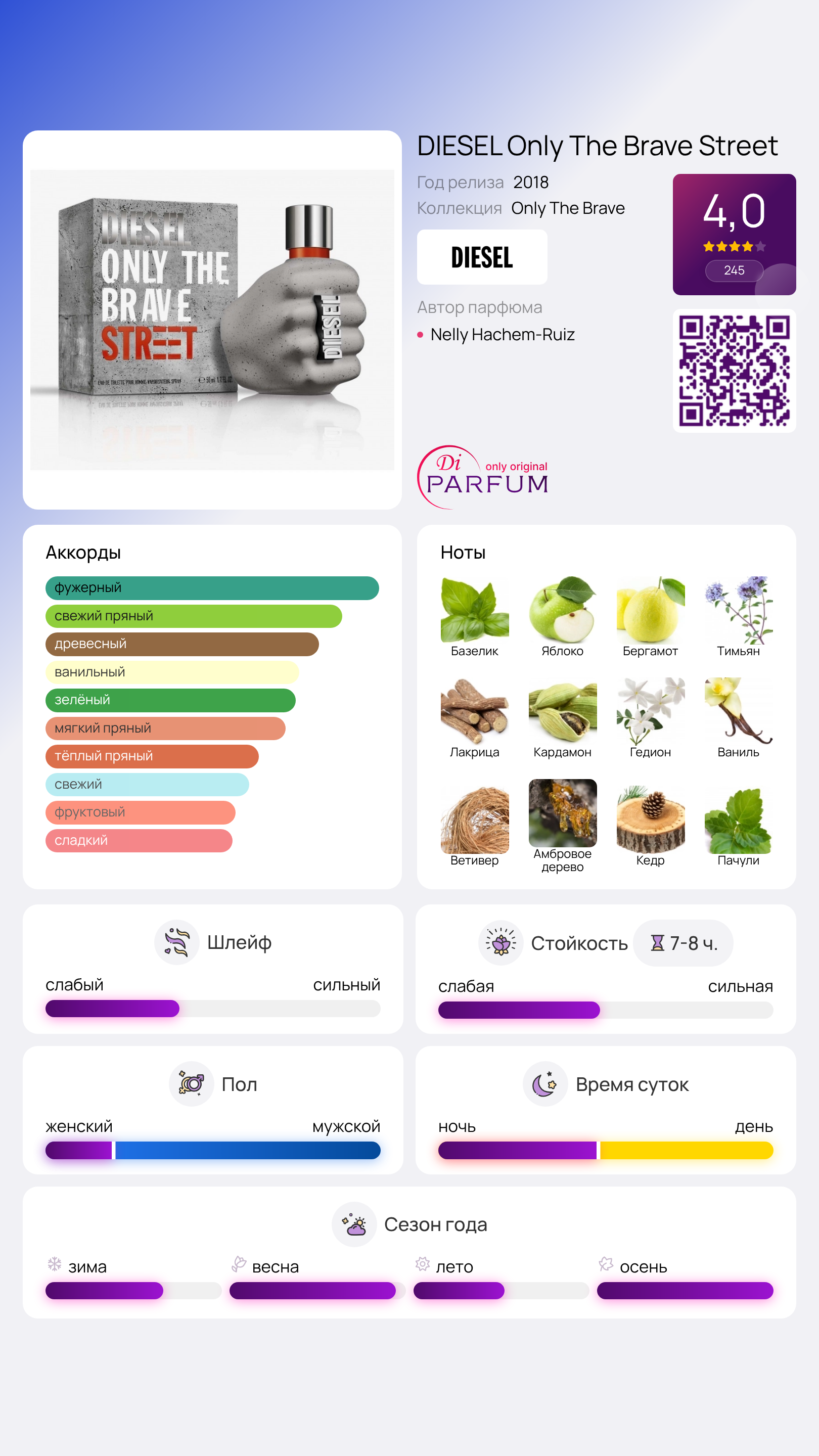 Бренд Diesel, ориентированный на молодежную аудиторию, представил свою последнюю новинку, которая отражает дух городской улицы — с ее рисками, внезапными поворотами и своеобразной романтикой. Стать настоящим королем улицы требует от человека смелости и уверенности в себе. Флакон Only The Brave Street выполнен в форме кулака, стилизованного под бетон, символизируя, что только смелые могут завоевать улицы.