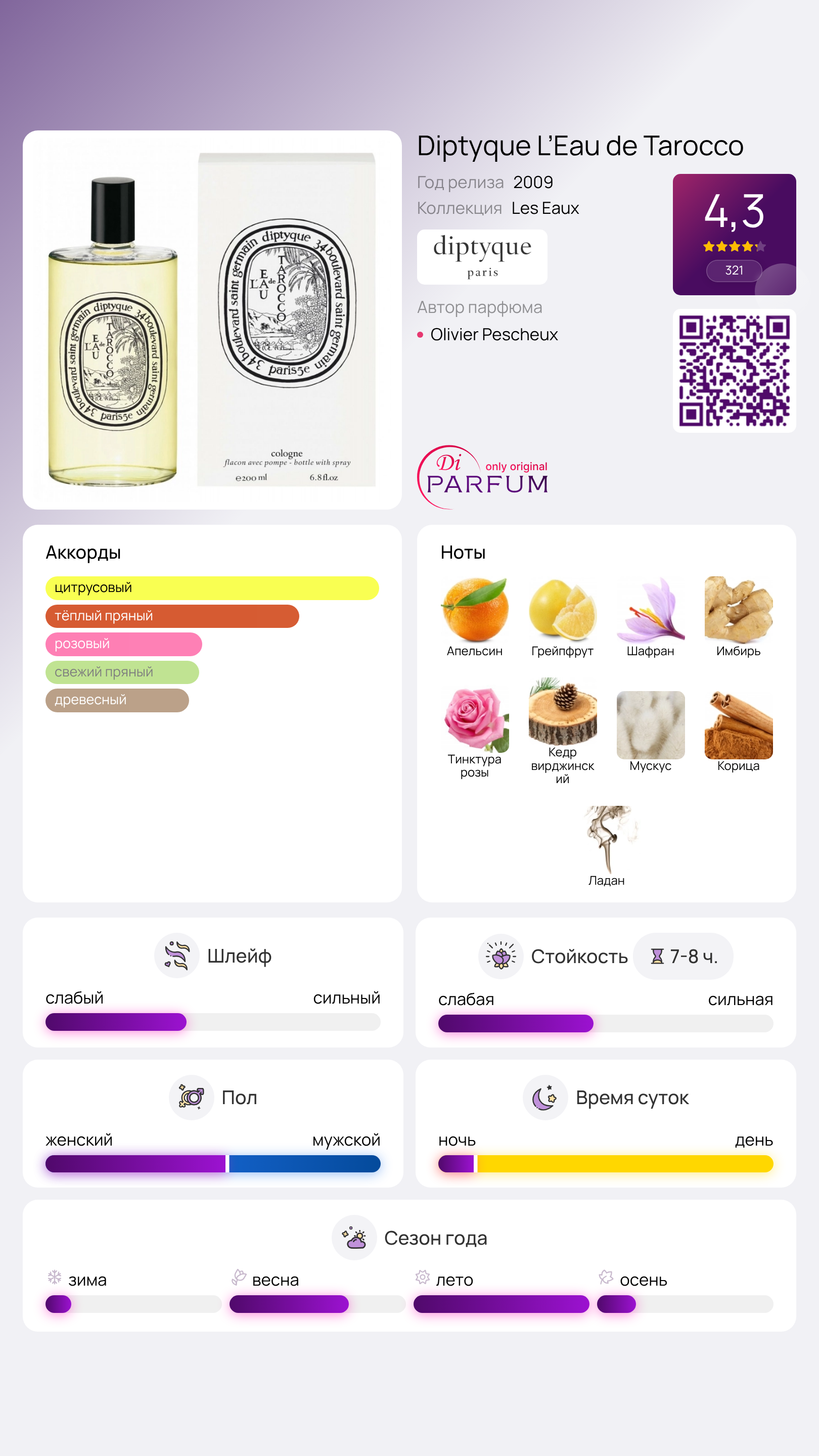Парфюм L’Eau de Tarocco переносит нас в живописный оазис, который словно оживляет безмолвную пустыню. Его аромат представляет собой целостное полотно, не разделяющееся на верхние, средние и базовые ноты.