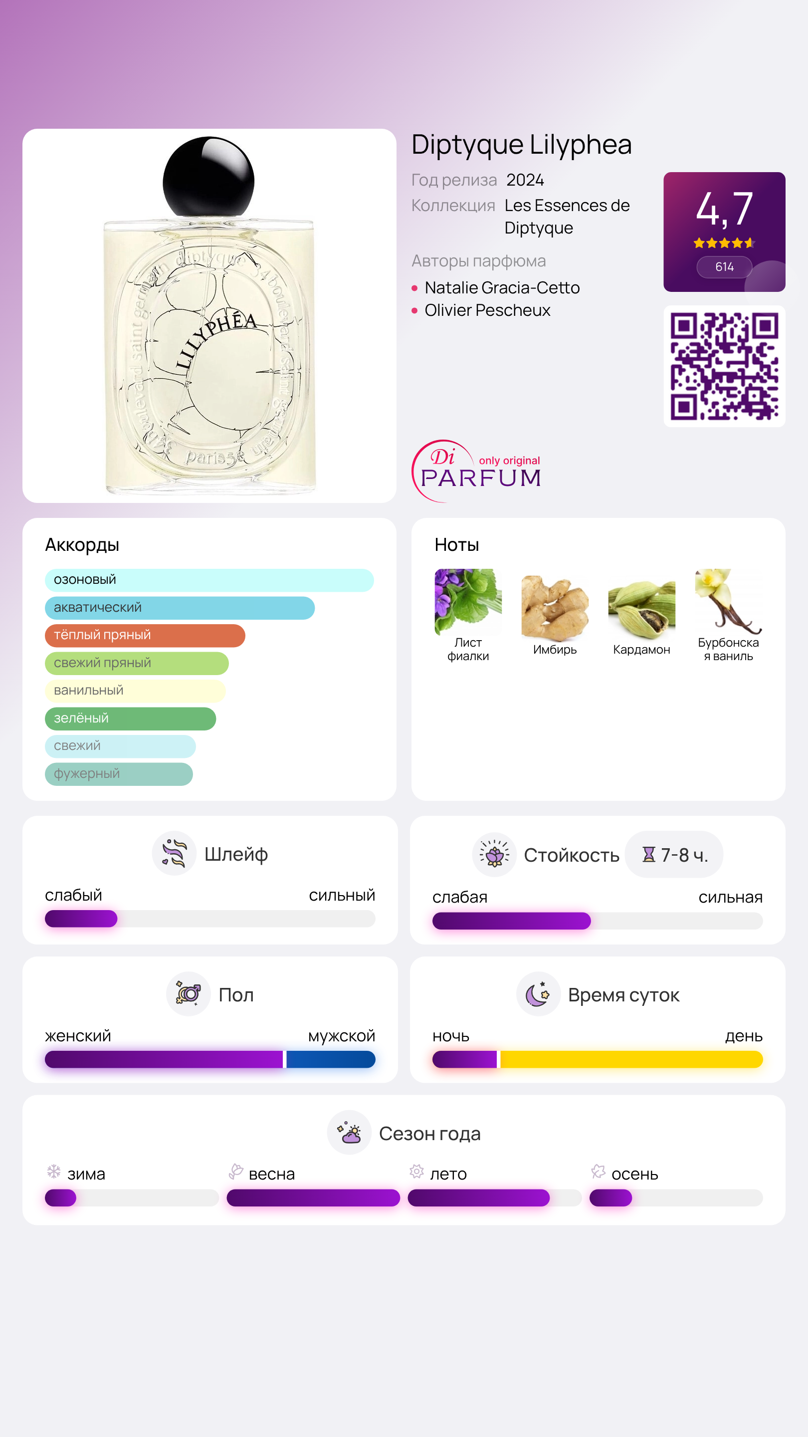 Lilyphéa от Diptyque — это восточно-цветочный аромат, созданный как для женщин, так и для мужчин. Этот новый аромат был представлен в 2024 году и является частью коллекции 'Les Essences de Diptyque'. За его создание отвечают знаменитые парфюмеры Оливье Пешо и Натали Грасиа-Сетто.