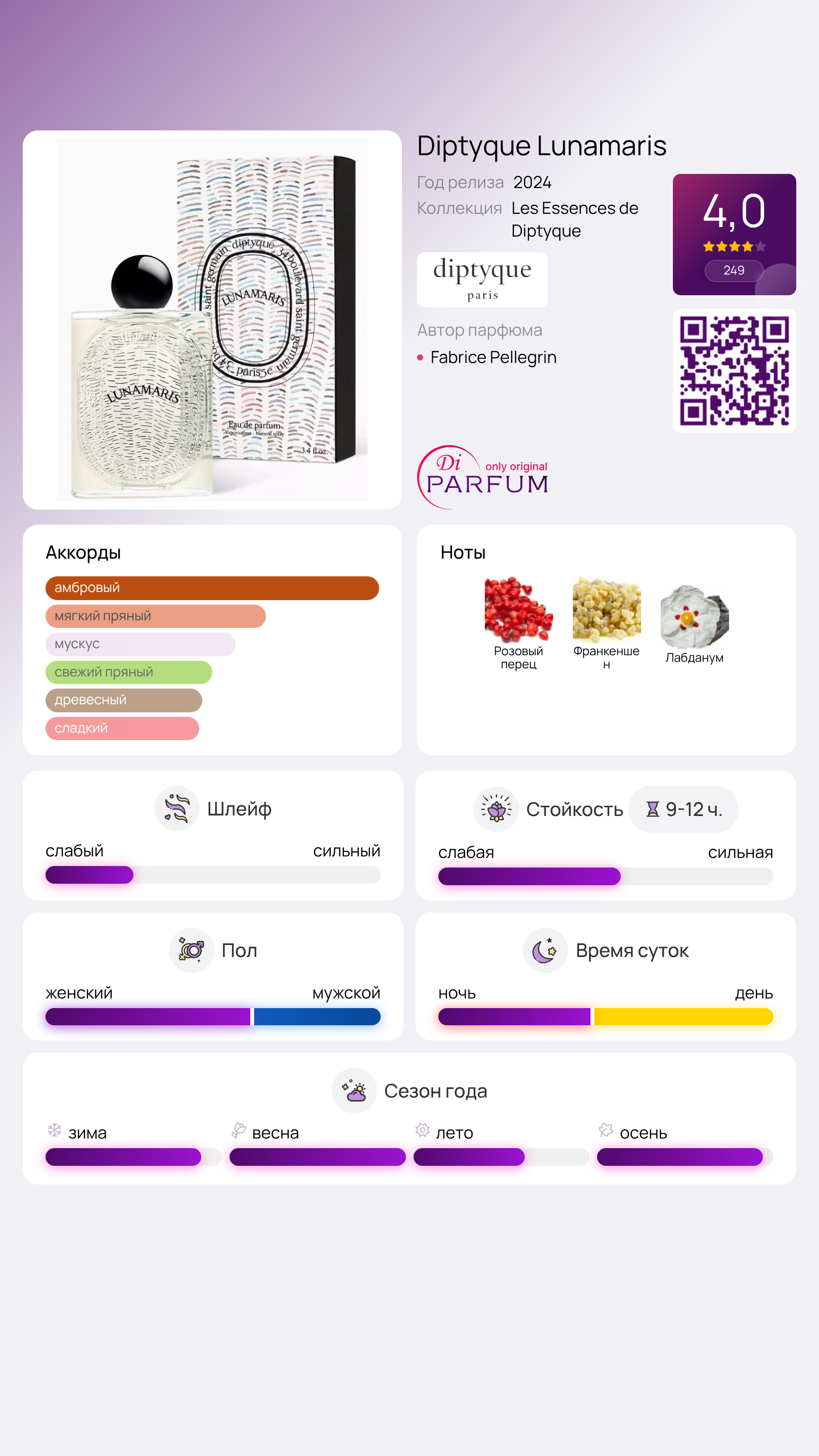 Lunamaris является частью коллекции "Les Essences de Diptyque" и выделяется среди прочих благодаря своей оригинальной комбинации нот. Аромат наполнен свежими и пряными оттенками: олибанум, розовый перец и лабданум сочетаются в гармоничную и загадочную композицию. Этот парфюм создает атмосферу таинственности и притягательности, подчеркивая индивидуальность своего обладателя.