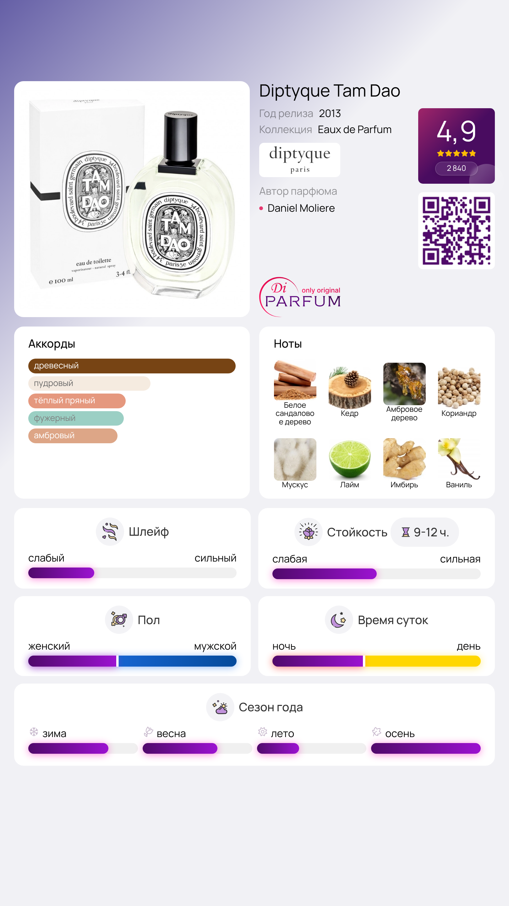 В 2003 году французская марка Diptyque выпустила новый цветочный парфюм под названием Tam Dao, который сочетает в себе утончённый мускусно-древесный оттенок. Как обычно, аромат стремится максимально отображать природные элементы и начинается с бодрящих акцентов кипариса, собранного на итальянских берегах, мирта и ароматной розы.