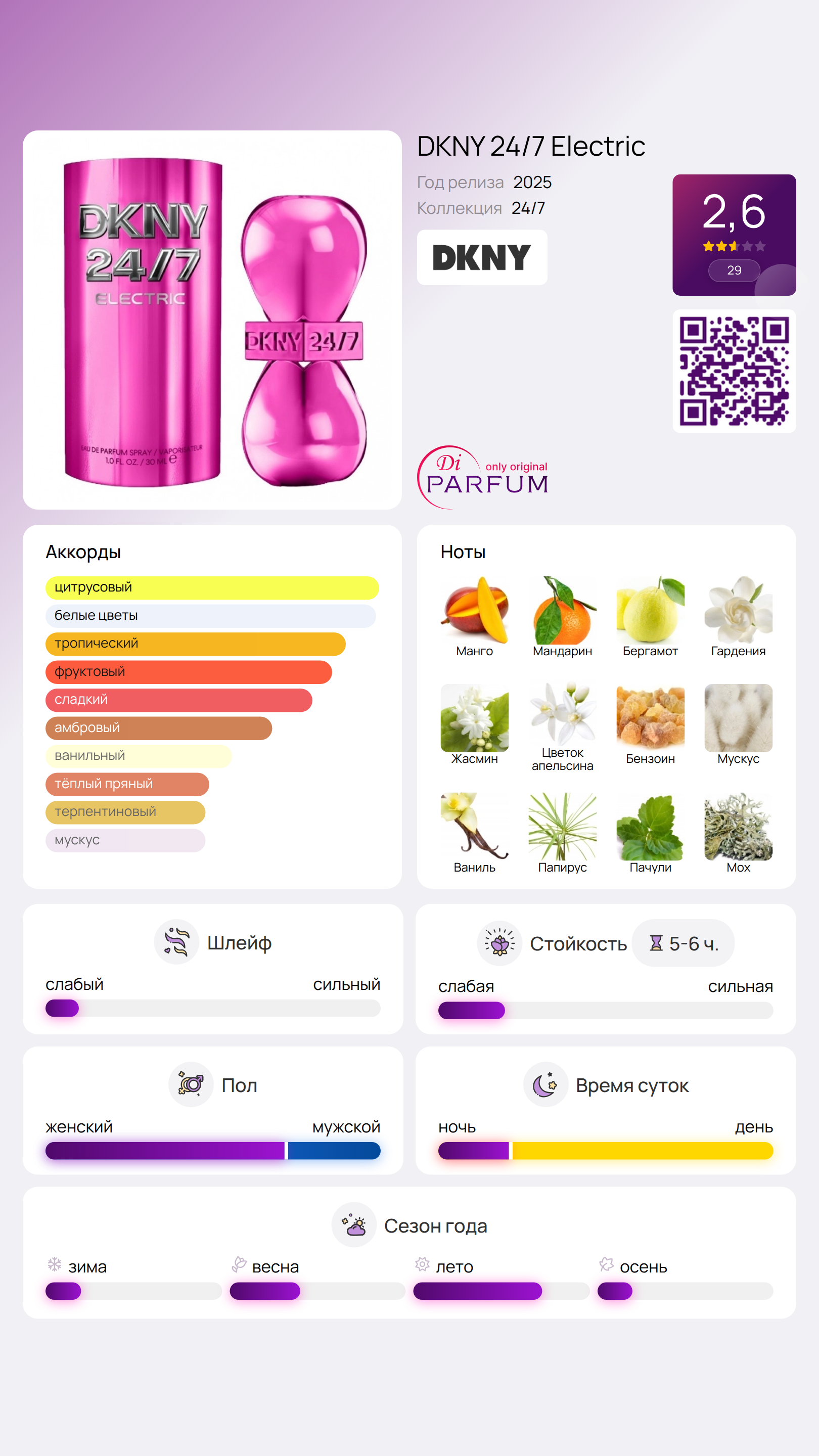 DKNY 24/7 Electric от Donna Karan - это восточно-цветочный аромат для женщин, который был представлен в 2025 году. Создателем этого уникального парфюма является парфюмер Лоран Ле Гернек. Аромат активно сочетает свежесть фруктов и цветочное очарование, делая его идеальным для активных и стильных женщин.