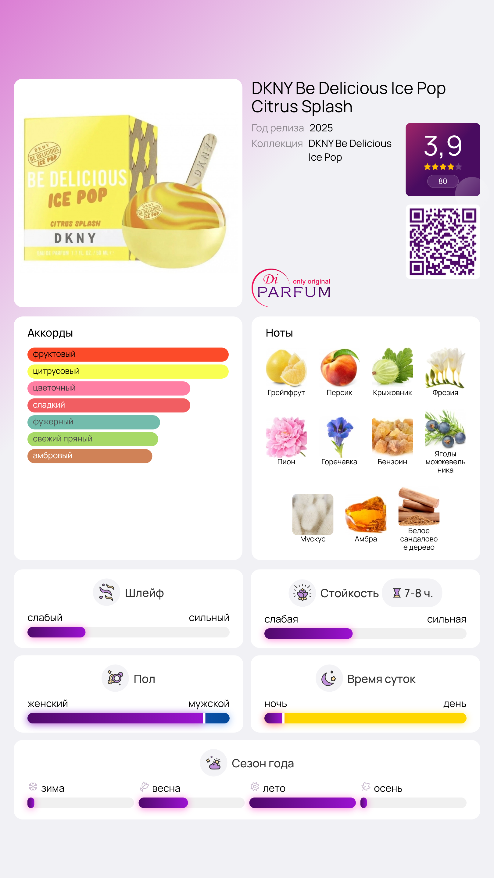 DKNY Be Delicious Ice Pop Citrus Splash от Donna Karan — это новый цветочно-фруктовый гурманский аромат для женщин, выпущенный в 2025 году. Этот парфюм удивляет своей яркой комбинацией фруктовых и цветочных нот, создавая освежающий и живой ароматный опыт.