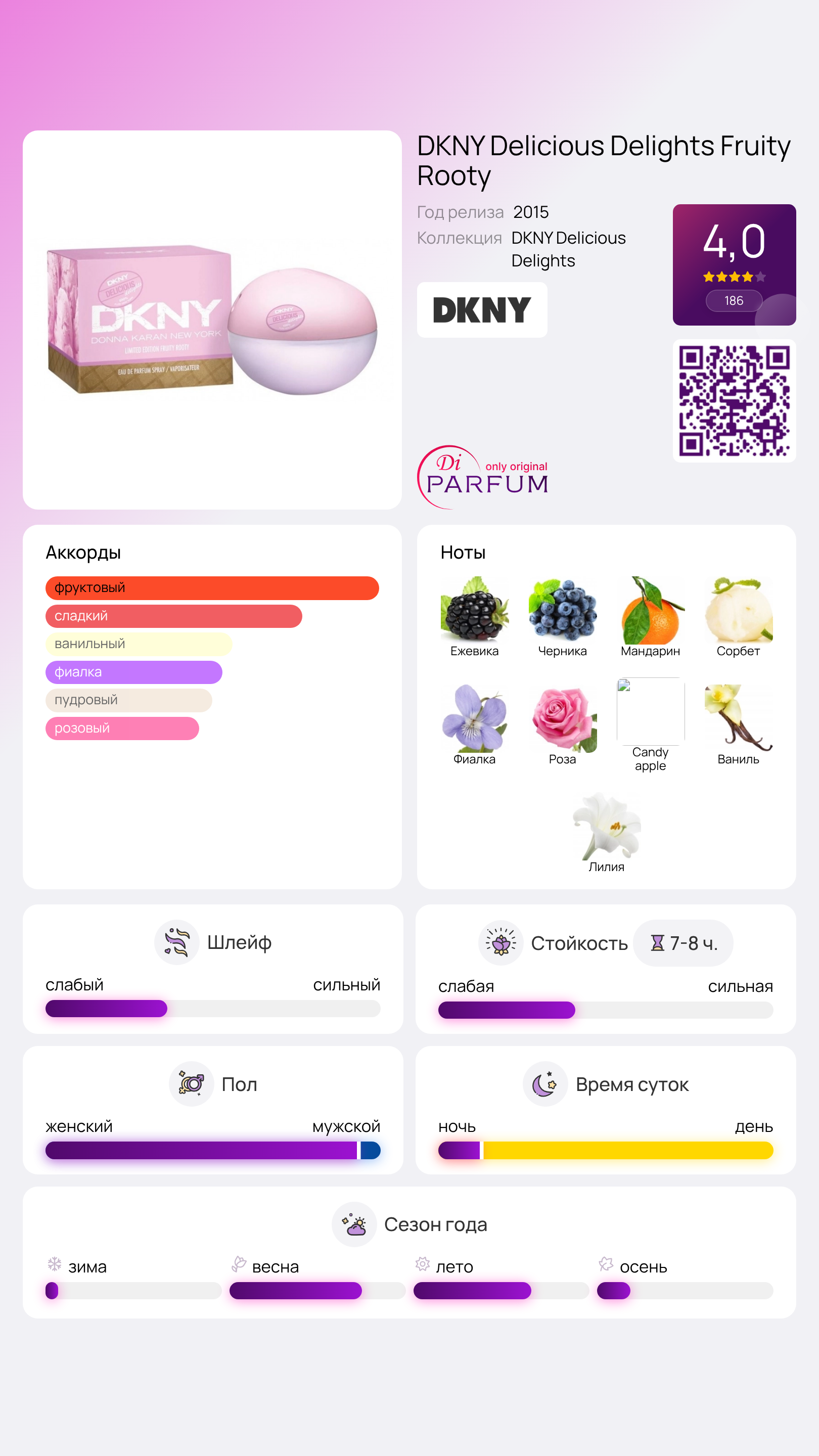 Композиция DKNY Delicious Delights Fruity Rooty представляет собой стильный цветочно-фруктовый букет, наполненный сладкими припудренными белыми цветами и яркими нотами цитрусовых. Она вдохновлена вкусом весеннего мороженого сорбета и начинается с волнующих акцентов лесной ежевики и черники.