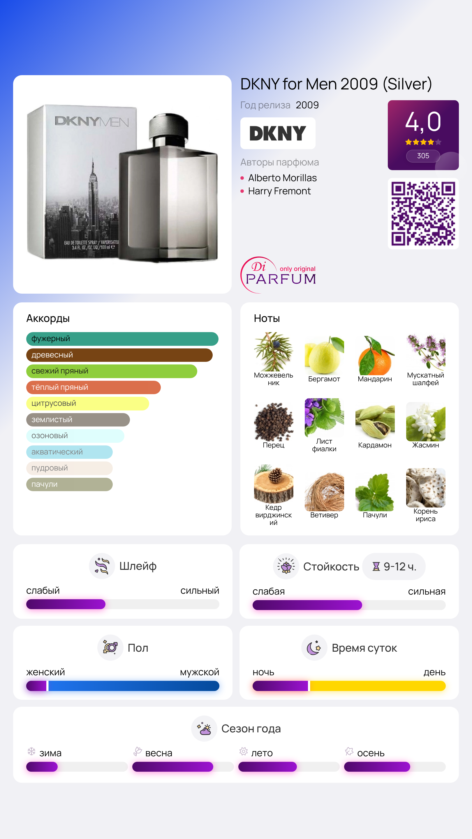 В его составе вы найдете такие акценты, как яркий грейпфрут, пряный хинин, сочные ягоды можжевельника, ароматное яблоко, элегантный жасмин, чувственное пачули и освежающие аккорды океанического бриза. Этот изысканный и современный аромат DKNY Silver Men станет настоящим магнитом для внимания дам.