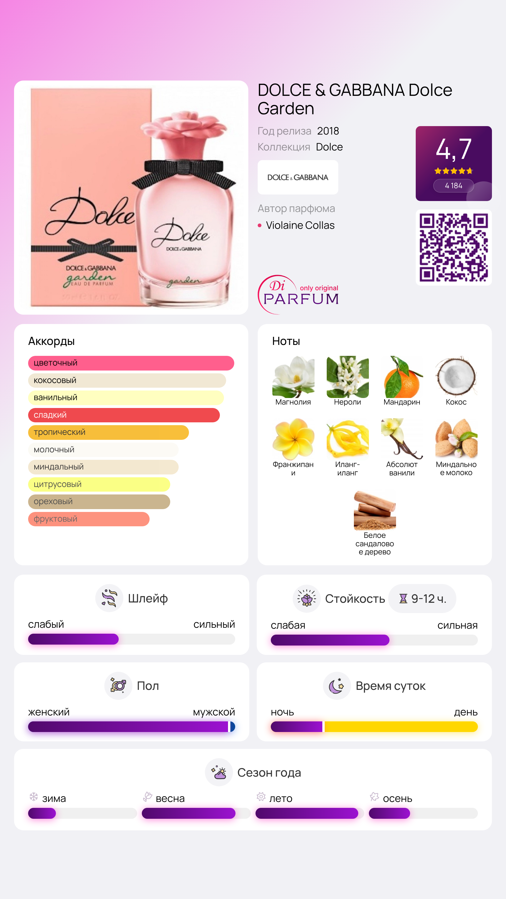 Аромат открывается нотами мандарина, магнолии, нероли и иланг-иланг, которые будто бы приоткрывают завесу Dolce Garden. В его сердце раскрывается благоухание апельсиновых лепестков и сладкой мякоти кокоса. А в завершающих нотах пирамиды гармонично сочетаются сандал с нежными ванильными оттенками и миндальное молоко.
