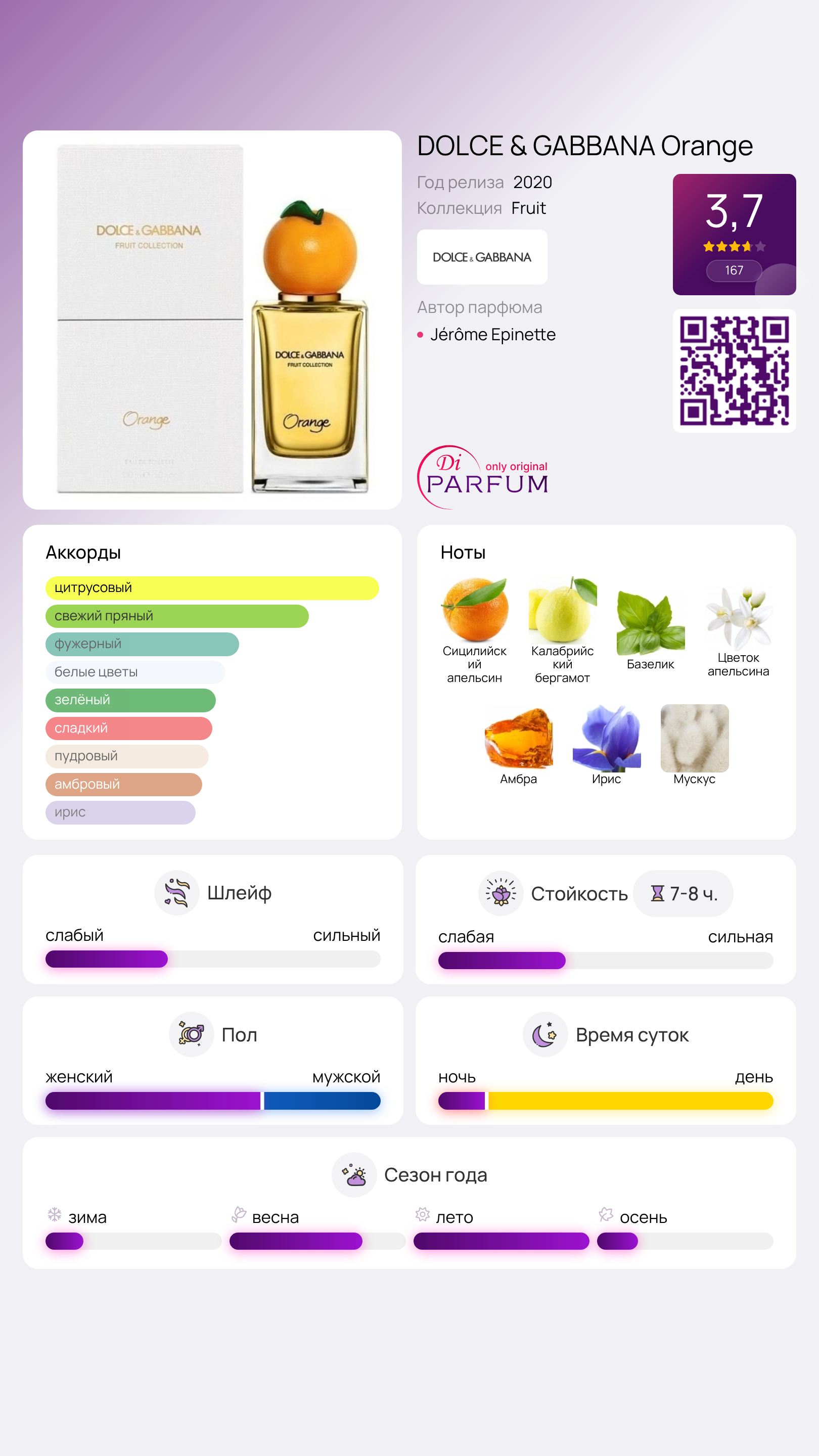 Флакон аромата Orange от Dolce&Gabbana оснащен крышечкой в форме апельсина, что делает его особенно привлекательным. Парфюмер Jerome Epinette создал аромат, где оптимизм, любовь и радость жизни легли в основу концепции цветочного фруктового букета. Аромат спелых цитрусов в сочетании со свежескошенной травой напоминает о солнечных цитрусовых рощах.