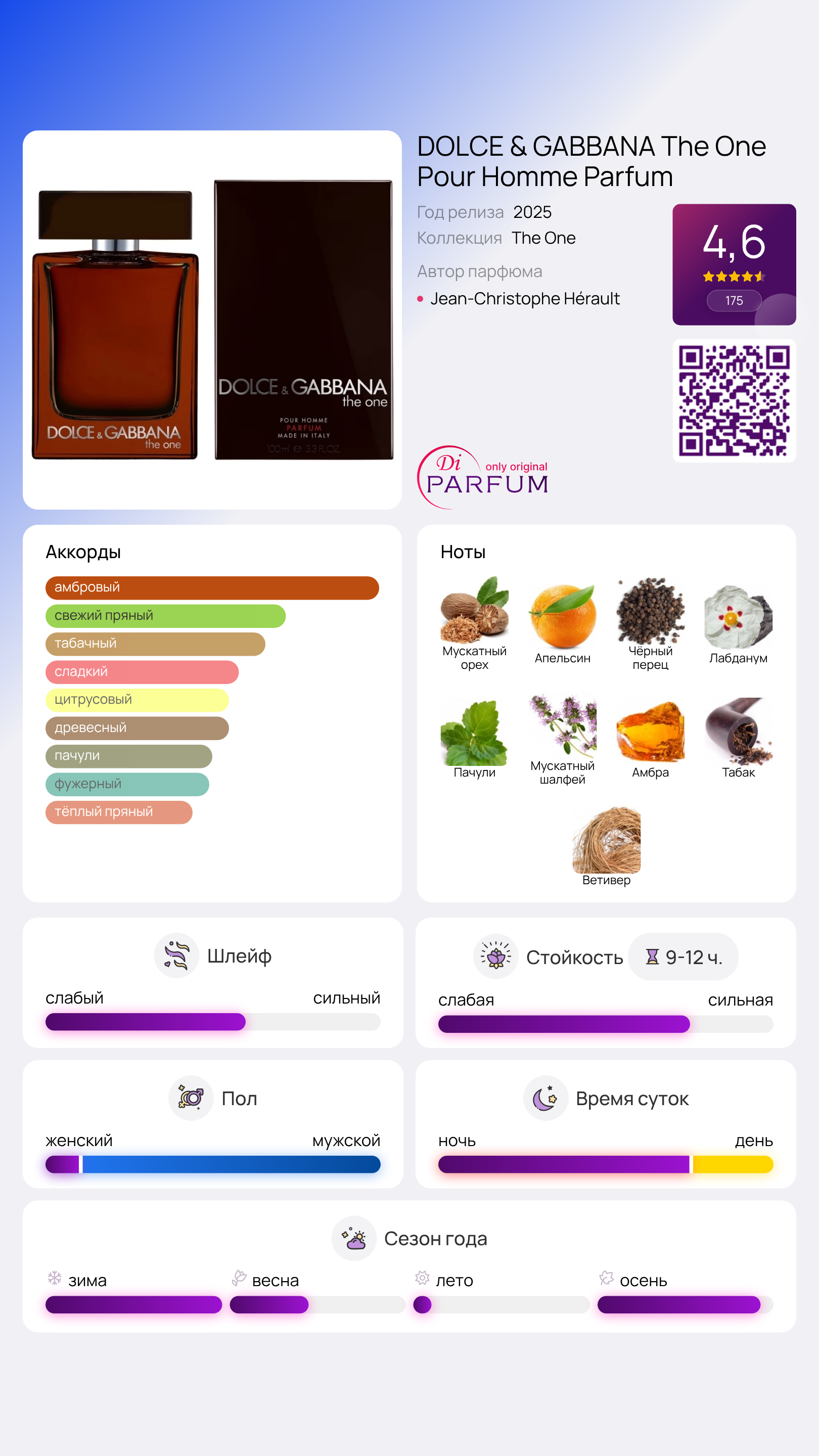 Этот аромат идеально подходит для уверенных в себе мужчин, которые ценят изысканные и запоминающиеся композиции. Прекрасный выбор для вечерних выходов и особых случаев, The One Pour Homme Parfum станет отличным дополнением к вашему арсеналу парфюмов.