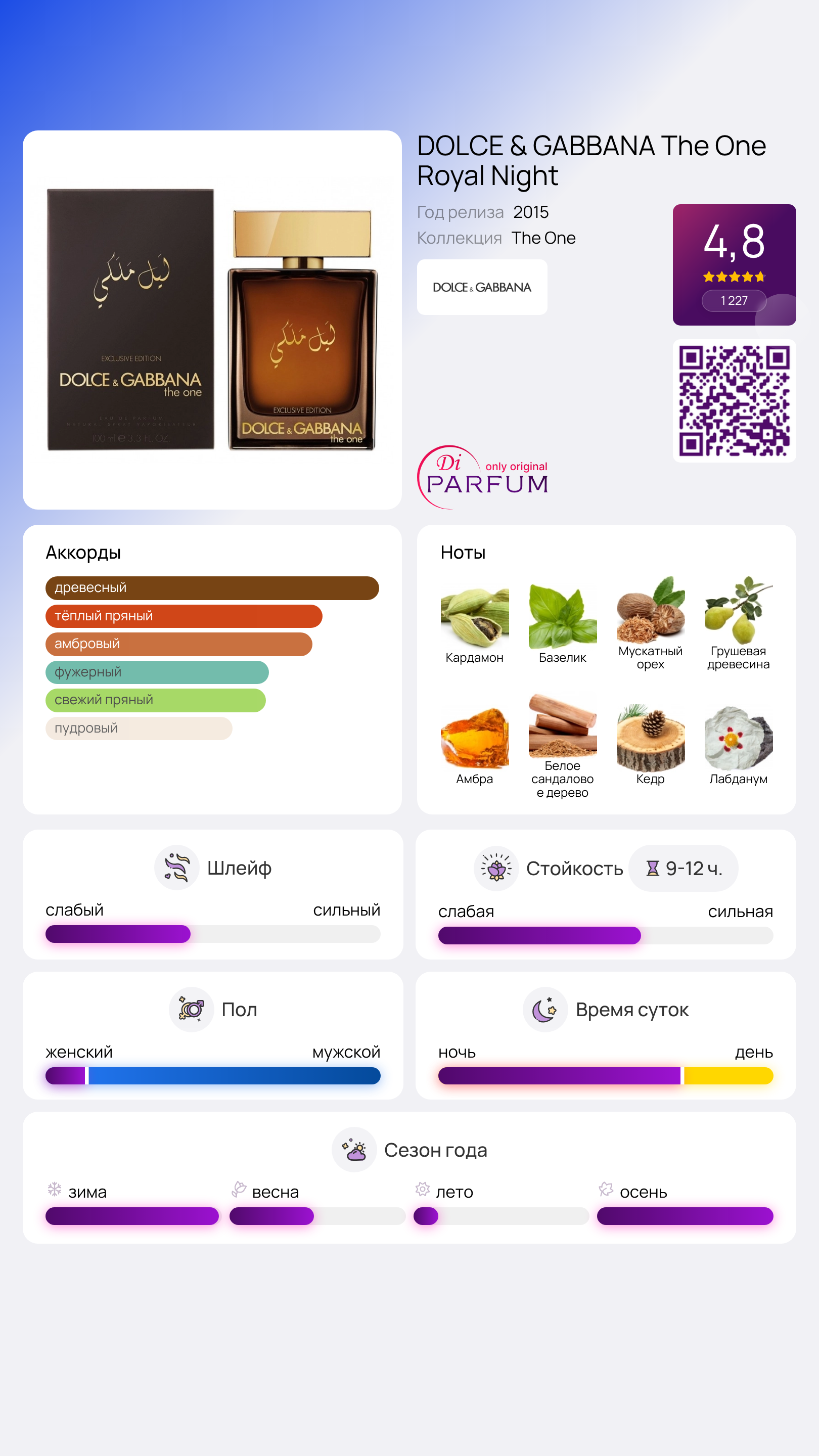 Создание парфюмерии — это подлинное искусство, и бренд Dolce & Gabbana продолжает удивлять своих почитателей новыми шедеврами в этом направлении. Мужской аромат The One Royal Night, который вышел в 2015 году в лимитированном выпуске для арабского рынка, относится к восточно-древесной группе и станет настоящим открытием для ценителей ярких, стойких и шлейфовых композиций.