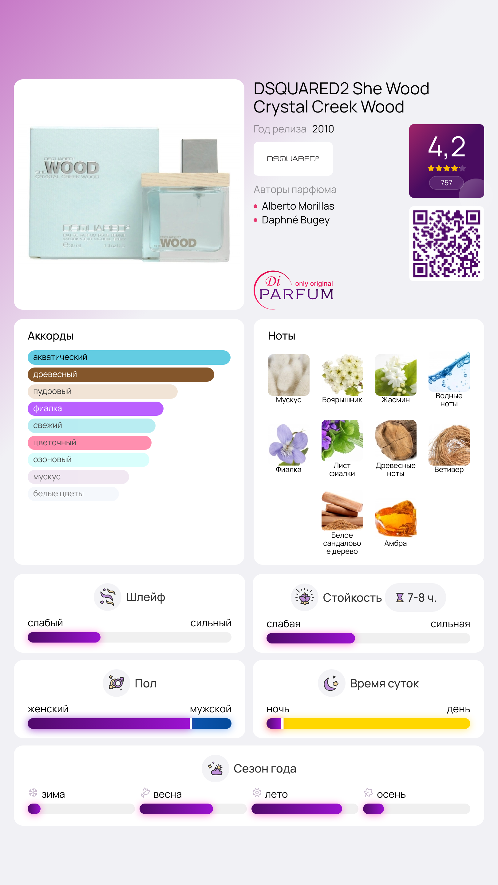 Следуя концепции ароматов "Wood", бренд Dsquared2 представляет новую парфюмерную пару, заявляя: "Природа всегда побеждает!" Мужская и женская версии, включая She Wood Crystal Creek Wood, предназначены для женщин, ценящих чистоту и гармонию естественного мира.