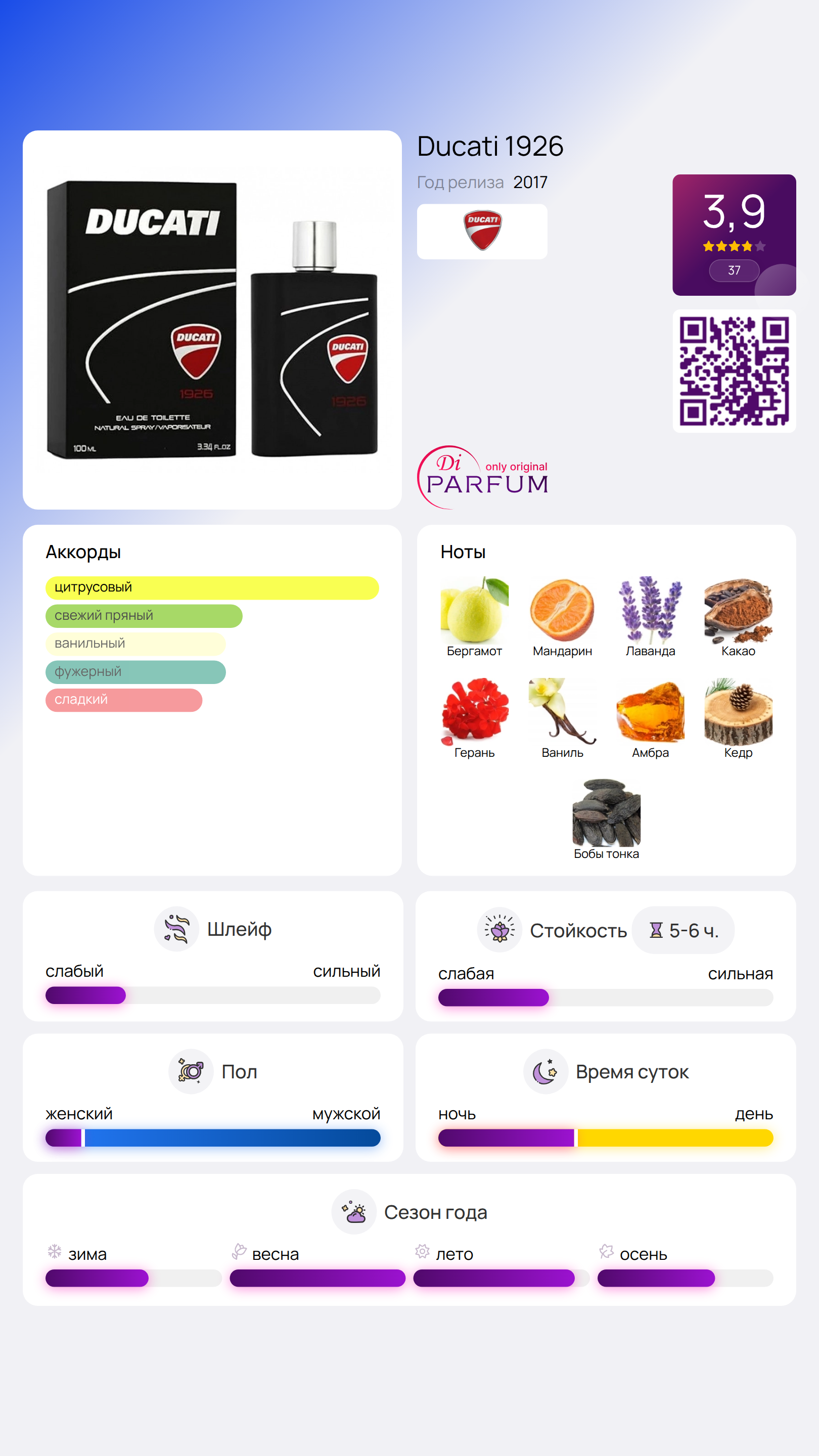 Ducati 1926 от Ducati – это ароматический фужерный парфюм для мужчин, выпущенный в 2017 году. Этот уникальный аромат создан для сильных и уверенных в себе мужчин, подчеркивая их решительность и харизму. Начальные ноты сочетают в себе свежесть бергамота и сладость танжерина, создавая яркую и энергичную композицию.