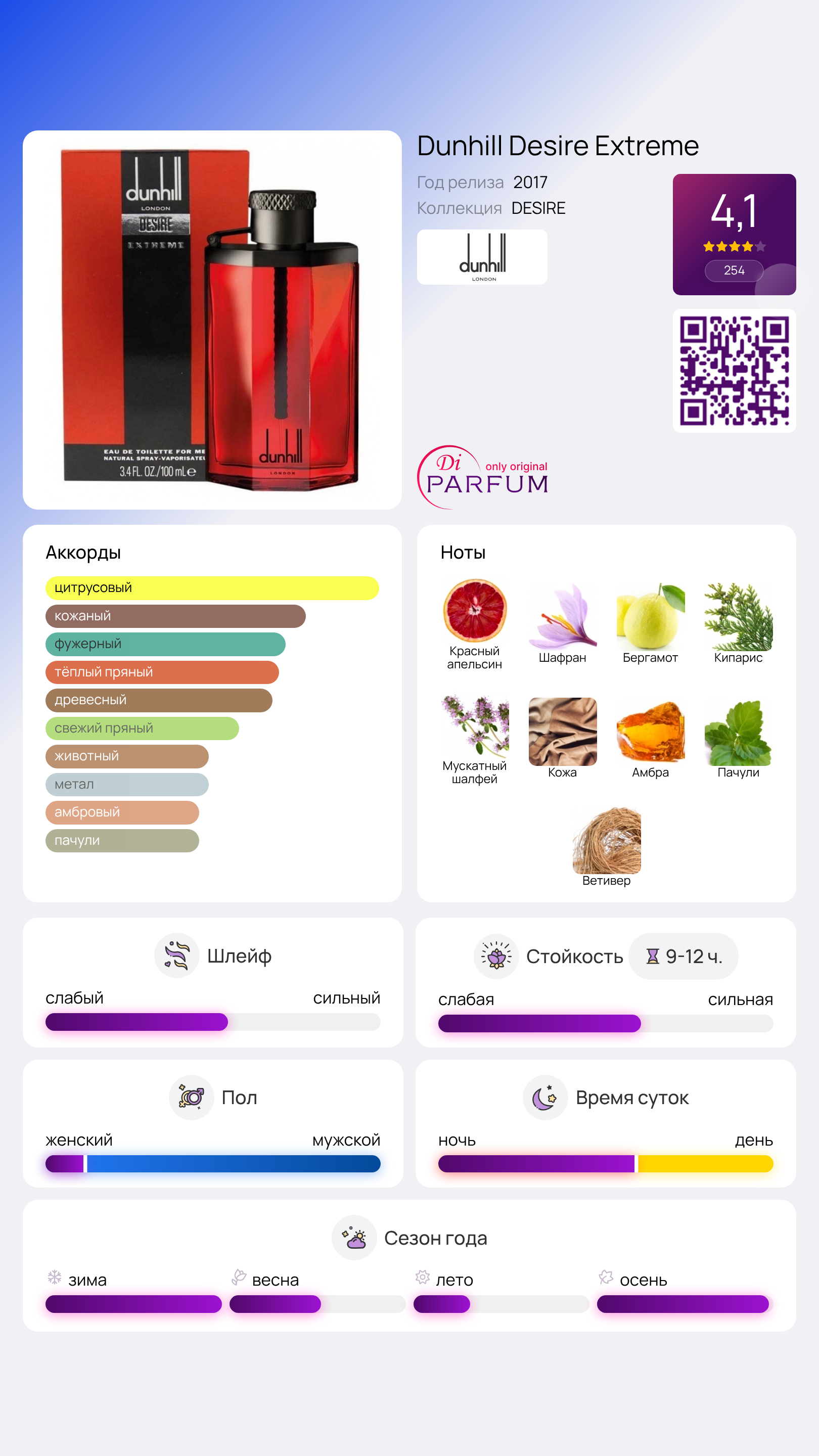 Парфюмерная линия Desire от британского бренда Alfred Dunhill включает в себя насыщенные ароматы, среди которых выделяется издание Desire Extreme. Этот парфюм воплощает в себе стремление и сильные эмоции, которые сложно преодолеть. Для передачи этих ощущений парфюмеры использовали уникальную кожаную композицию с яркими цитрусовыми акцентами.