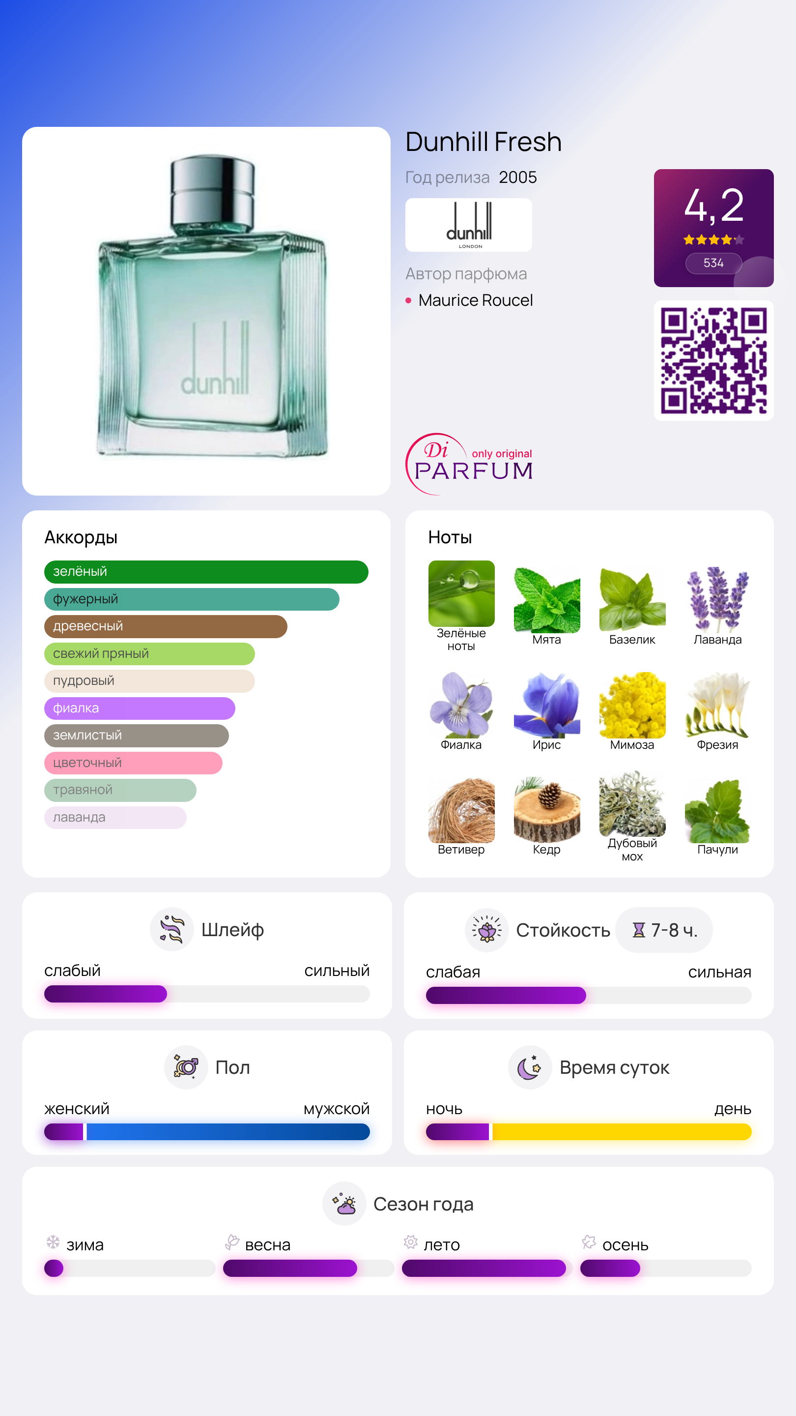 Зеленые акценты и древесные нюансы гармонично перекликаются с базиликом и фрезией, а эти ноты плавно переходят в сердце композиции, где царят ирис и фиалка. Все это создает оригинальный и легко запоминающийся аромат Dunhill Fresh.