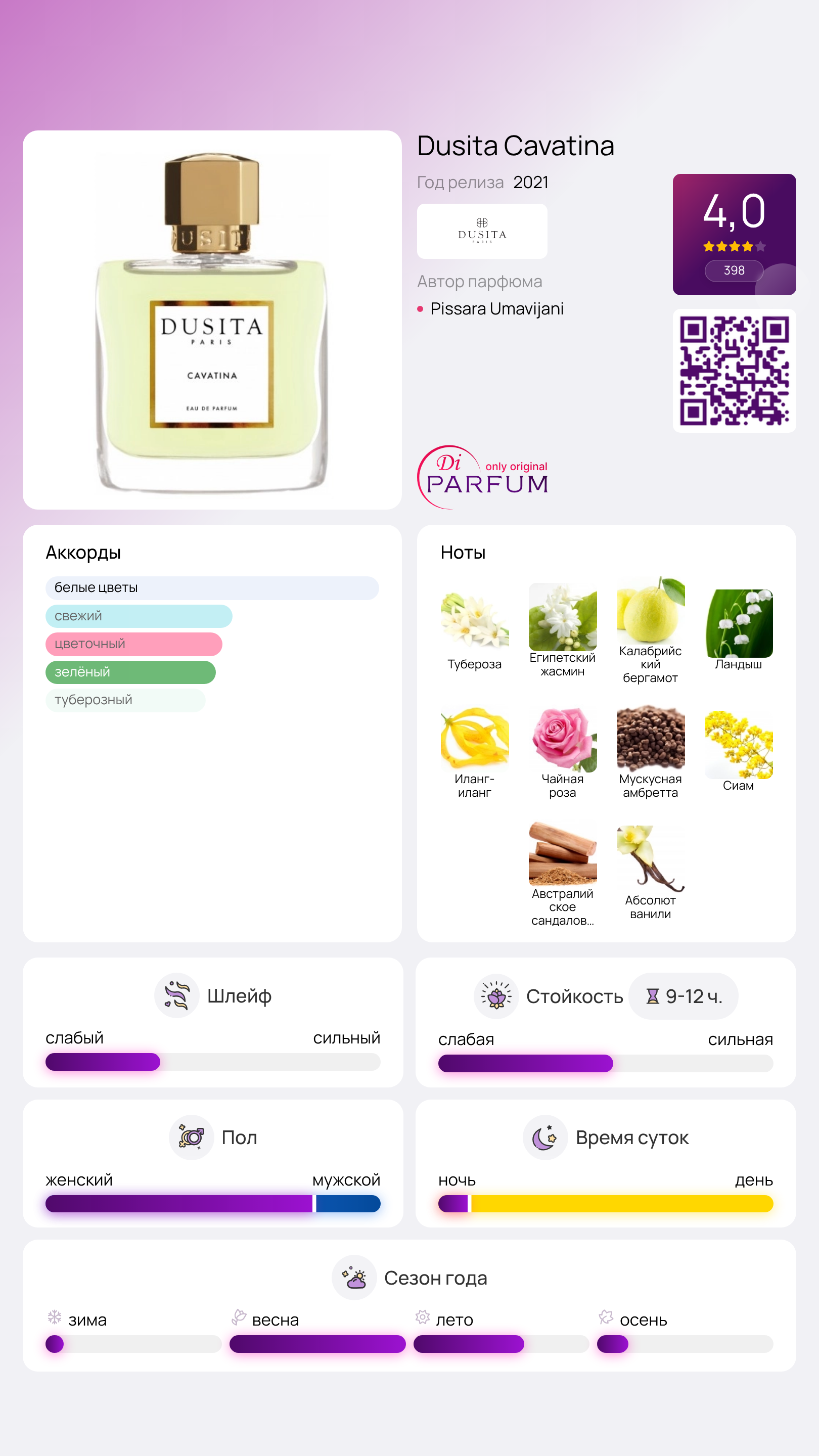 Парфюм Dusita Cavatina с утончённым цветочным ароматом черпает вдохновение из французских традиций, в частности, из обычаев, связанных с Первомаем, когда принято дарить букеты ландышей. Он воссоздает атмосферу винтажных духов и, по мнению создателей, является ароматической симфонией для души. Это произведение посвящено человечности, что является характерной чертой настоящего француза. Созданный с любовью, этот ландышевый винтаж сочетает в себе оригинальность и современную яркость.