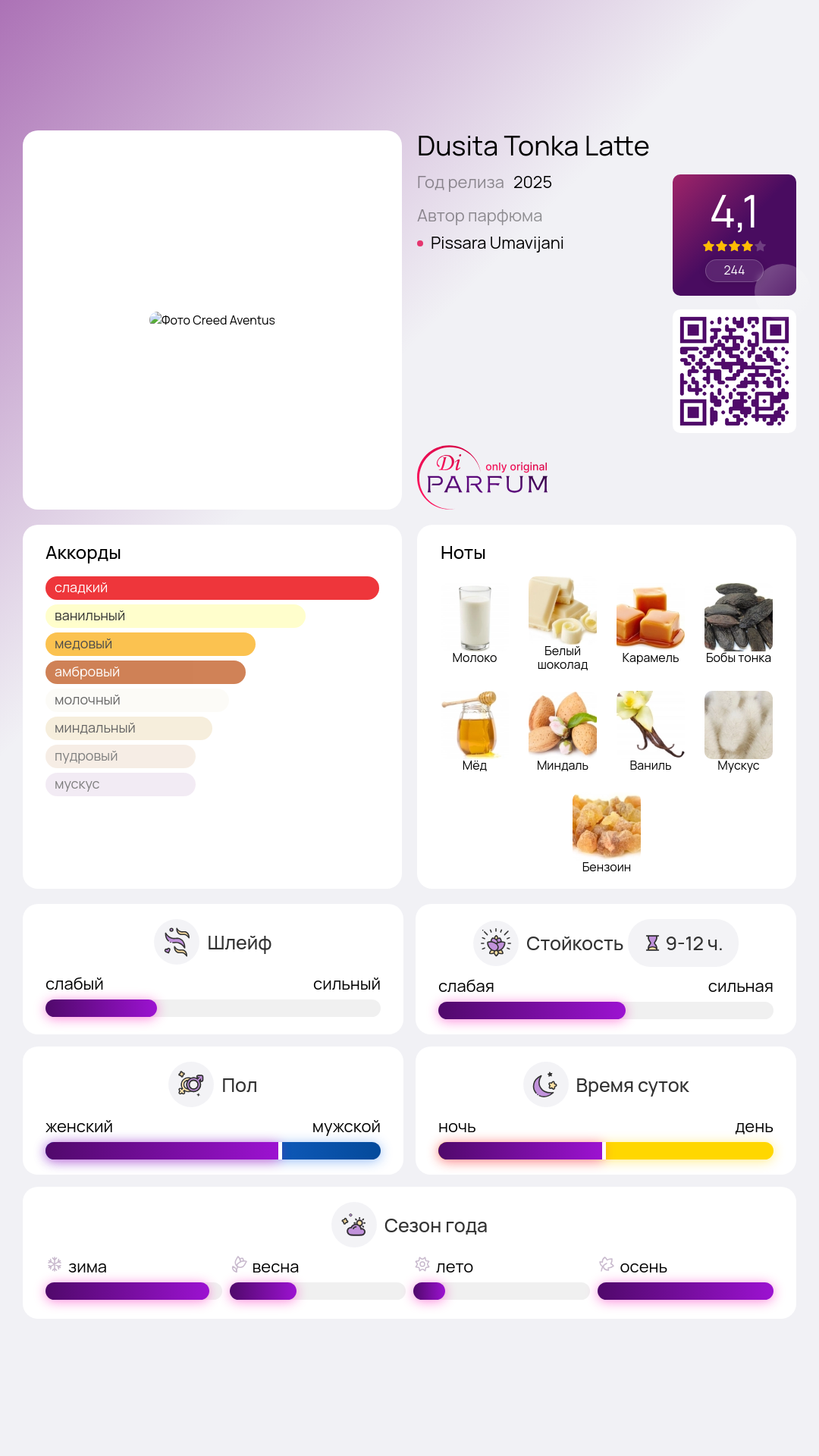 Tonka Latte – это идеальный выбор для любителей сладких и восточных ароматов, которые ценят богатство и многогранность парфюмерных произведений. Он прекрасно подойдет для холодных дней, создавая атмосферу уюта и тепла.
