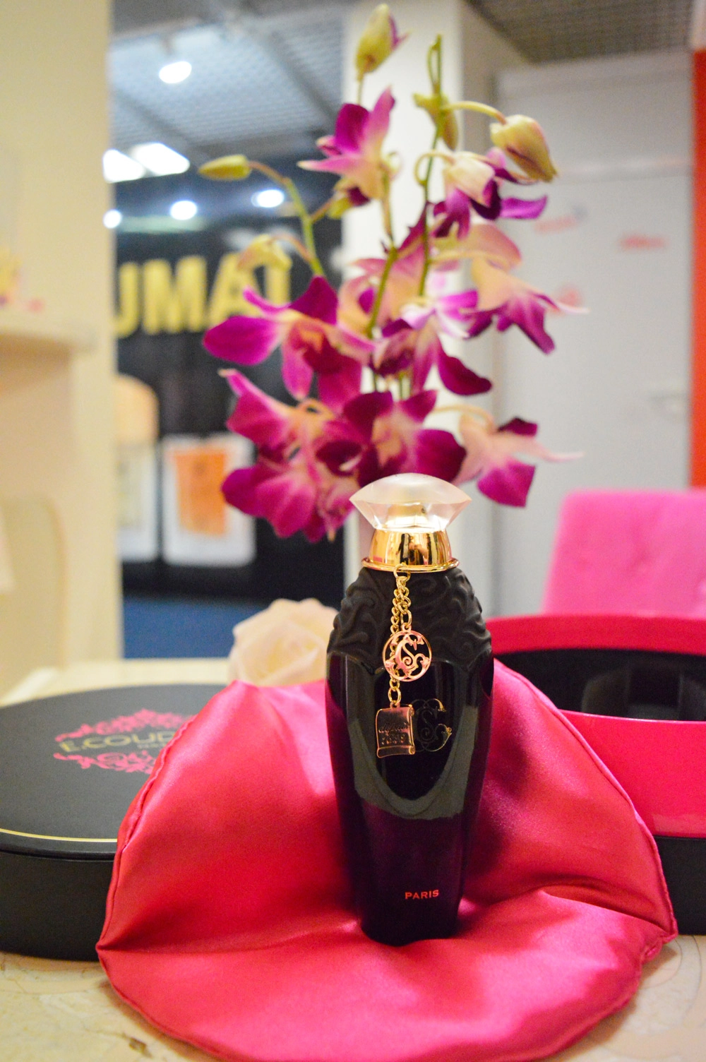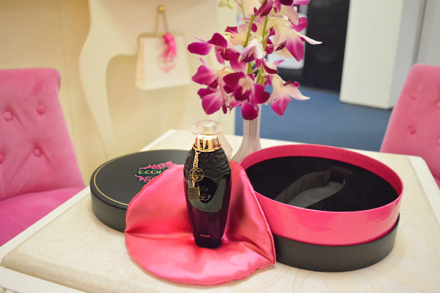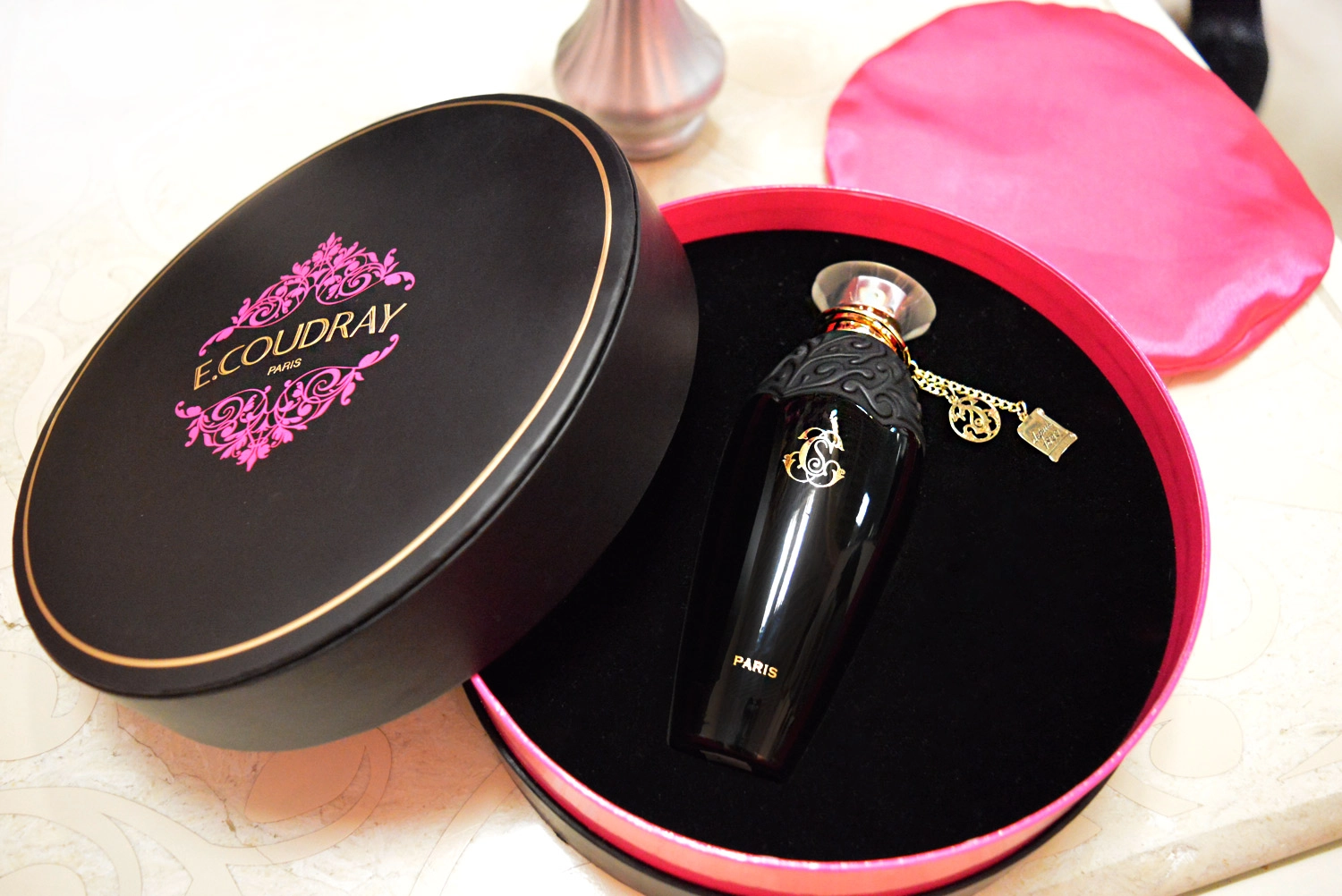 Дизайн упаковки возвращает нас к XVIII веку во Франции, когда такие подарки были признаком элитарности и статуса. Элегантная темная коробочка с изысканным узором и окантовкой цвета фуксии скрывает внутри истинную драгоценность – стильный черный флакон с ароматом E. Coudray Ylang Ylang. Он выполнен в ретро-стиле и оформлен позолотой, узорами, цепочкой и двумя подвесками, подчеркивающими его утончённость.
