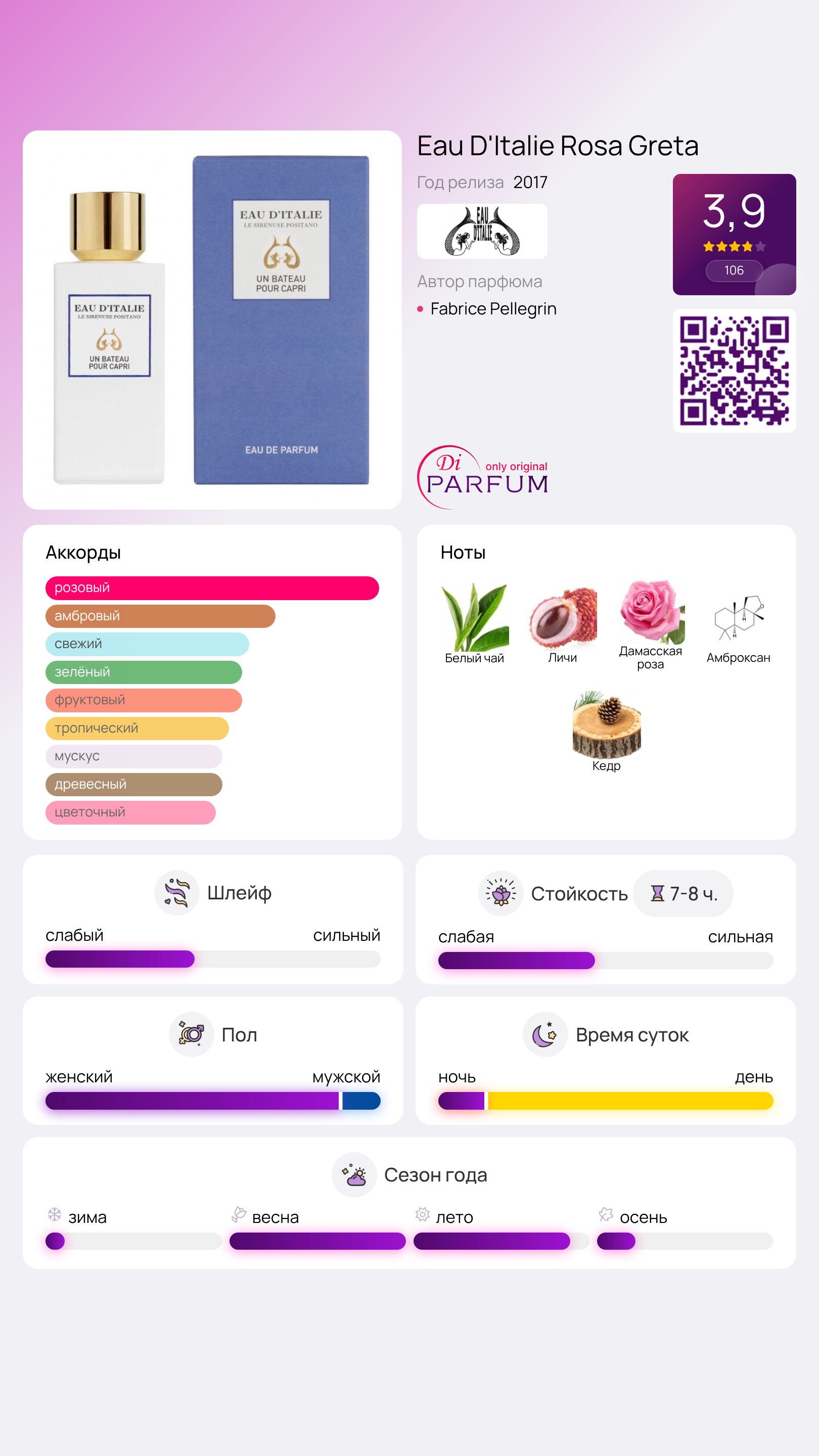 Rosa Greta от Eau D'Italie – это изысканный цветочный аромат, созданный как для женщин, так и для мужчин. Выпущенный в 2017 году, этот парфюм стал настоящим воплощением элегантности и утонченности. За его созданием стоит талантливый парфюмер Fabrice Pellegrin, который сумел объединить удивительные ноты в гармоничную композицию.