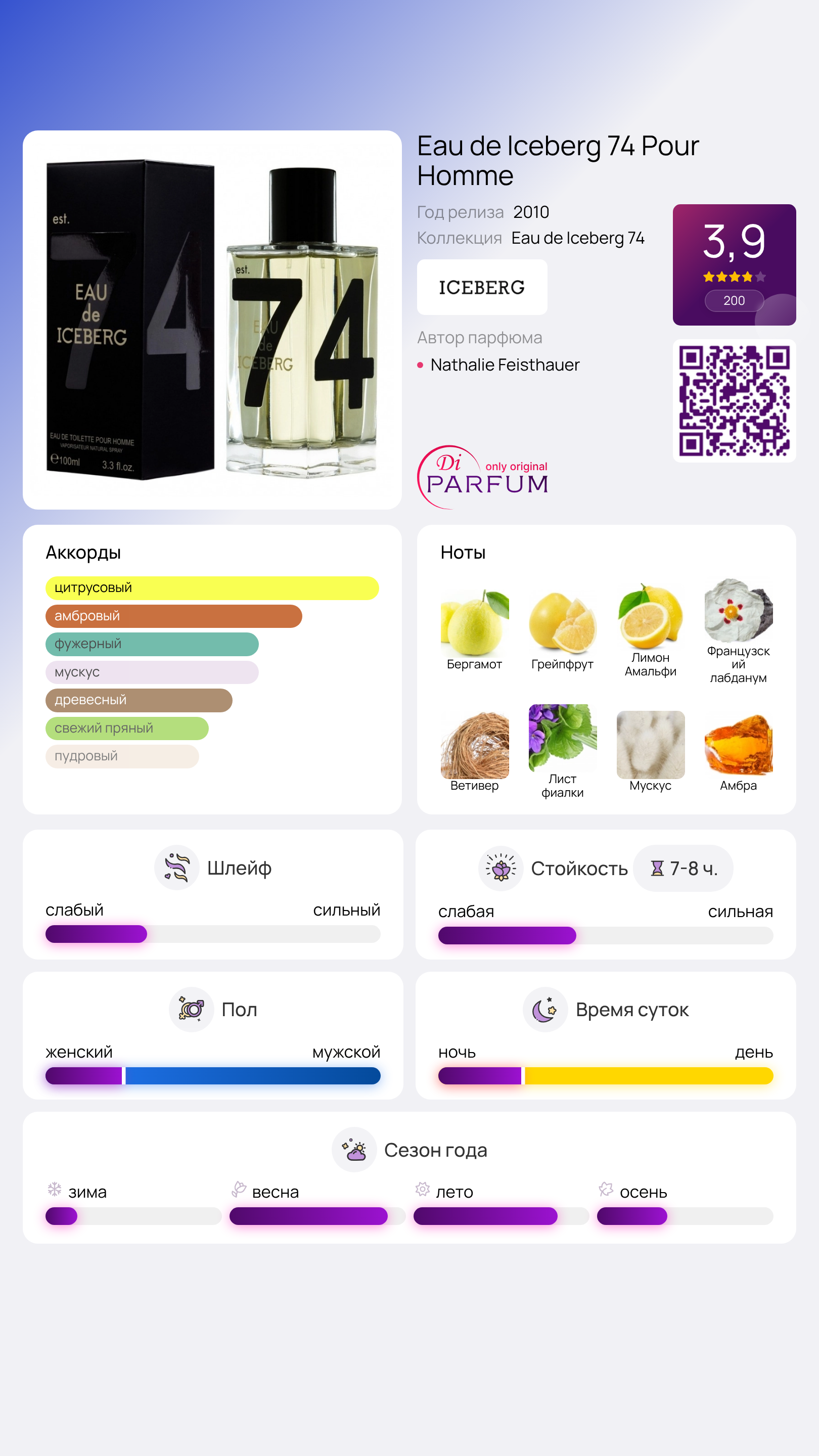 Аромат Eau de Iceberg 74 Pour Homme представляет новую интерпретацию стиля итальянской элегантности в сочетании с духом спорта от парфюмерного бренда Iceberg. В этом парфюме уравновешенно переплетаются традиционные ценности и динамичный образ мегаполиса, восхитительные манеры и современные темпы жизни. В каждой ноте Eau de Iceberg 74 Pour Homme проявляются волшебные преображения, где аккорды ветивера приобретают мягкость и мелодичность, как звучание волшебной виолончели. Этот аромат был выпущен в 2010 году.