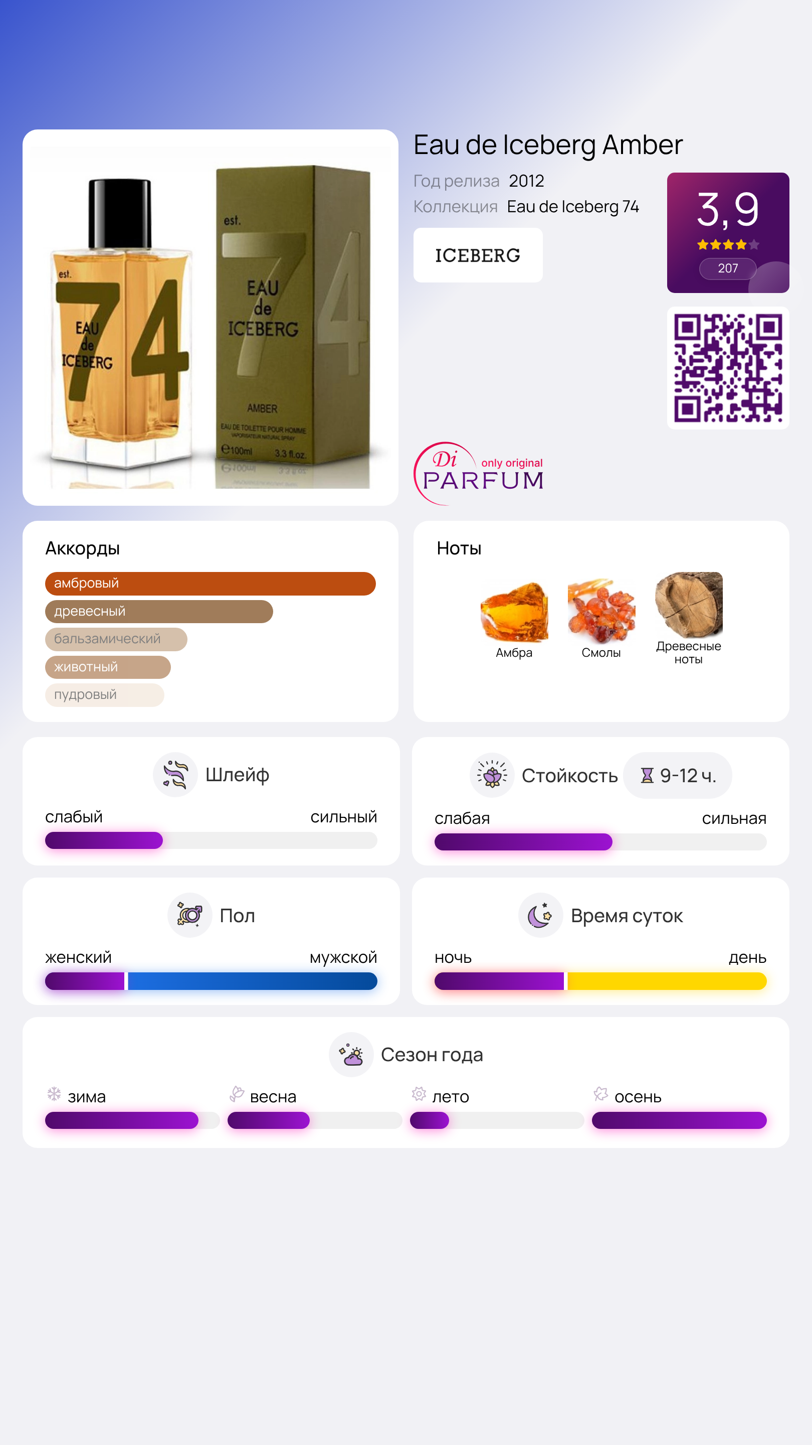 В 2012 году итальянский бренд Iceberg нарушил традиционные рамки, презентовав свою интерпретацию восточных ароматов для европейских мужчин - туалетную воду Eau de Iceberg Amber. В этом аромате идеально сочетаются восточные ноты с освежающей легкостью, идеальной для повседневного использования. Роскошное сочетание смол и амбры добавляет этому парфюму уникальности, тогда как древесные оттенки немного смягчают аромат, делая его подходящим для современных мужчин, ведущих активный образ жизни в мегаполисах.