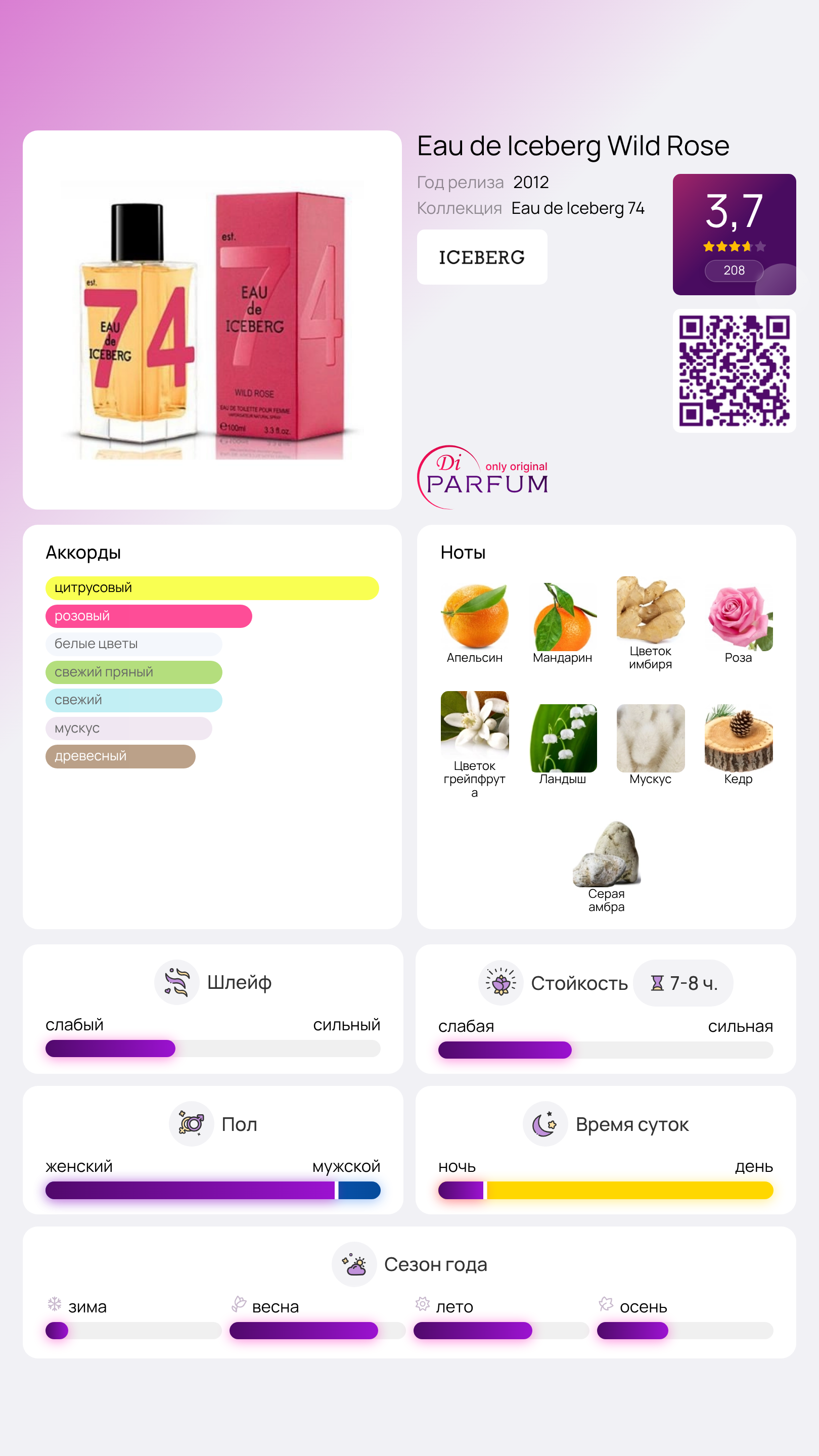 Парфюм Eau de Iceberg Wild Rose был выпущен в 2012 году итальянским модным брендом Iceberg. Удивительная красота дикой и очаровательной розы дополнена яркими нотами гавайского имбиря, мандарина, ландыша и грейпфрута. Композицию аромата дополняют мускус, серая амбра и нежный белый кедр, создавая волнующую атмосферу. Этот превосходный парфюм придаст особую чувственность, которая не оставит равнодушным никого, вне зависимости от пола.