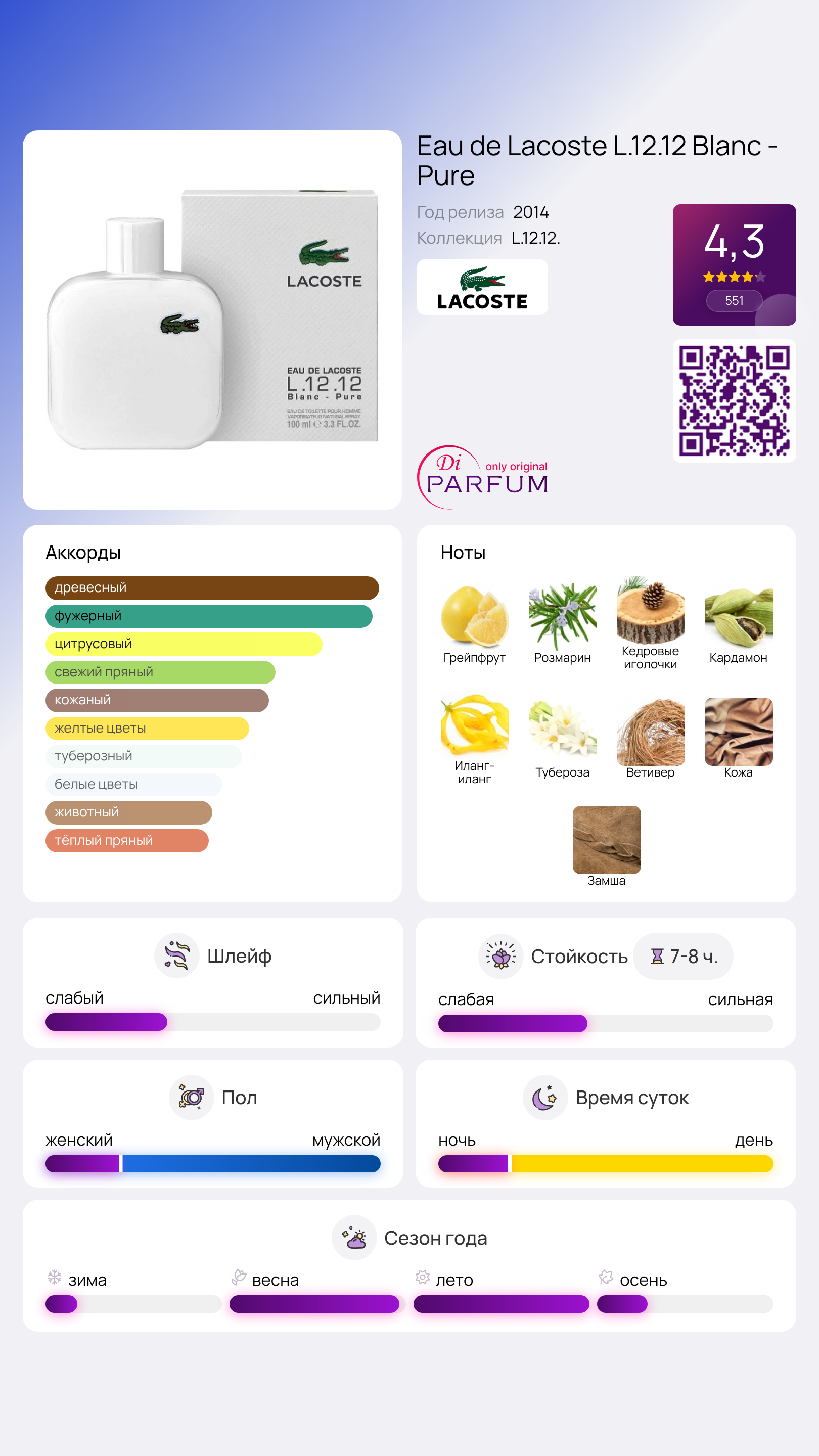 Рекомендуется использовать Eau de Lacoste L.12.12 Blanc некурящим мужчинам в качестве летнего аромата для продолжительных прогулок на свежем воздухе и умеренных физических активностей. Эта серия не очень хорошо переносит резкие перепады температур, оставаясь в основном легким цветочным шлейфом на фоне цитрусовых и нескольких пряных нюансов, которые нужно ещё исследовать.