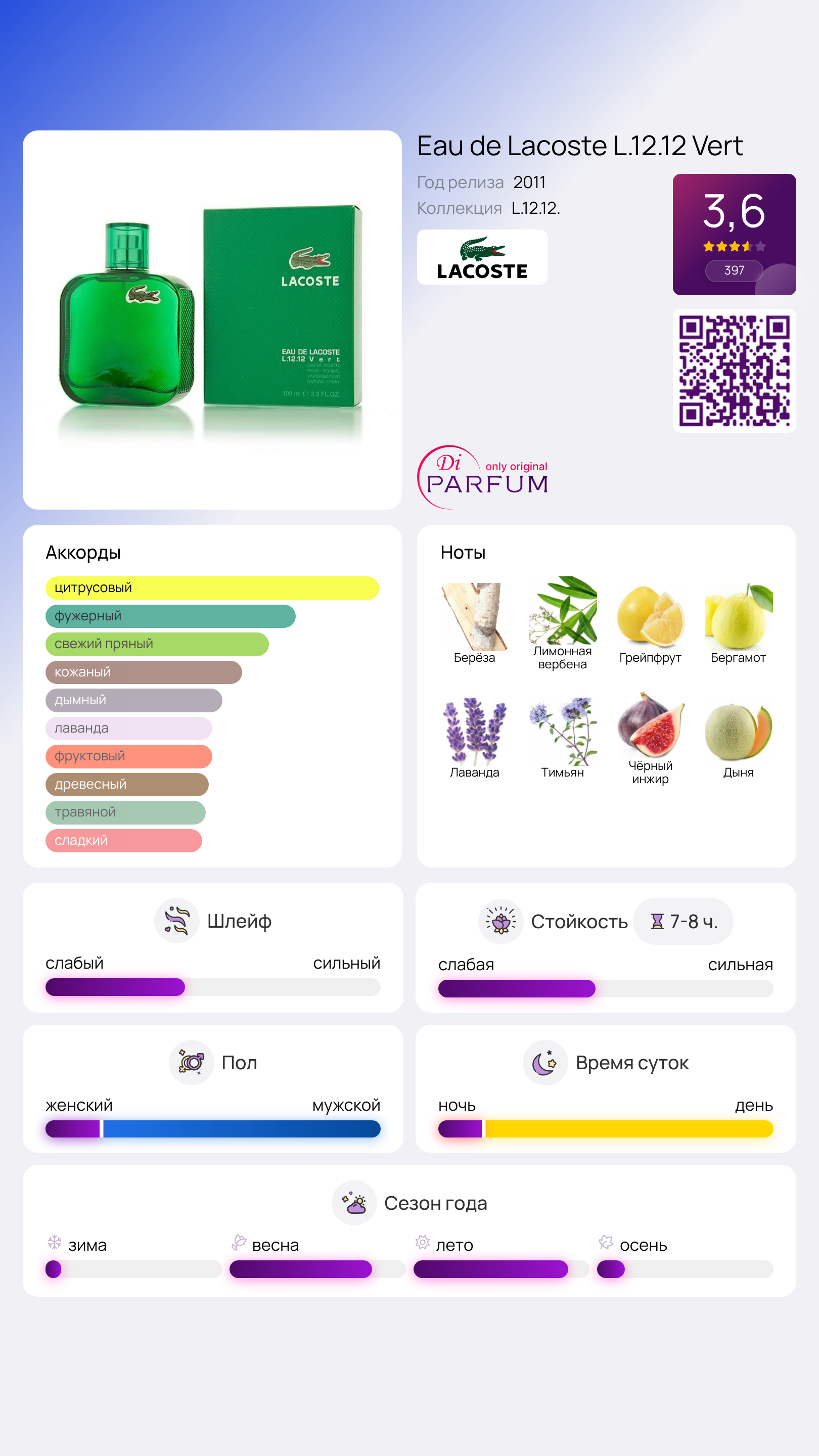 Когда все прочие оттенки радуги из коллекции мужских духов уже раскуплены, ярко-зеленый флакон L.12.12 Vert от Lacoste станет настоящим открытием. Те, кто успел его опробовать, утверждают единодушно: этот аромат самый уникальный, скажем даже, дерзкий из всех. И обсуждения вокруг него не утихают до сих пор.