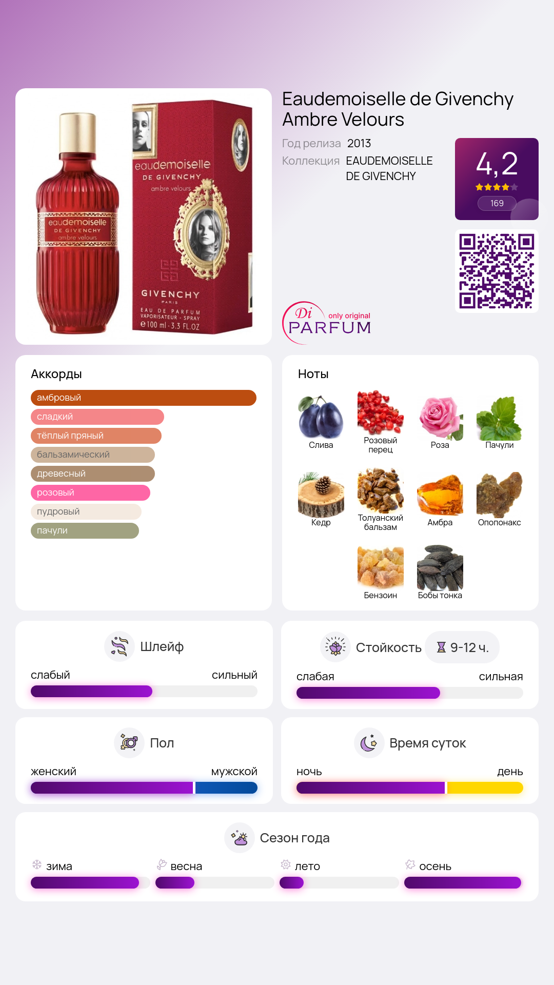 Верхние ноты аромата открываются сладковатым сочетанием сливы и пикантного розового перца, которые создают завораживающее первое впечатление. Сердечные ноты раскрываются чувственными аккордами розы, пачули и кедра, добавляя глубину и комплексность. Завершают композицию насыщенные базовые ноты толуанского бальзама, амбры, опопонакса, бензоина и бобов тонка, придавая аромату теплый и стойкий шлейф.