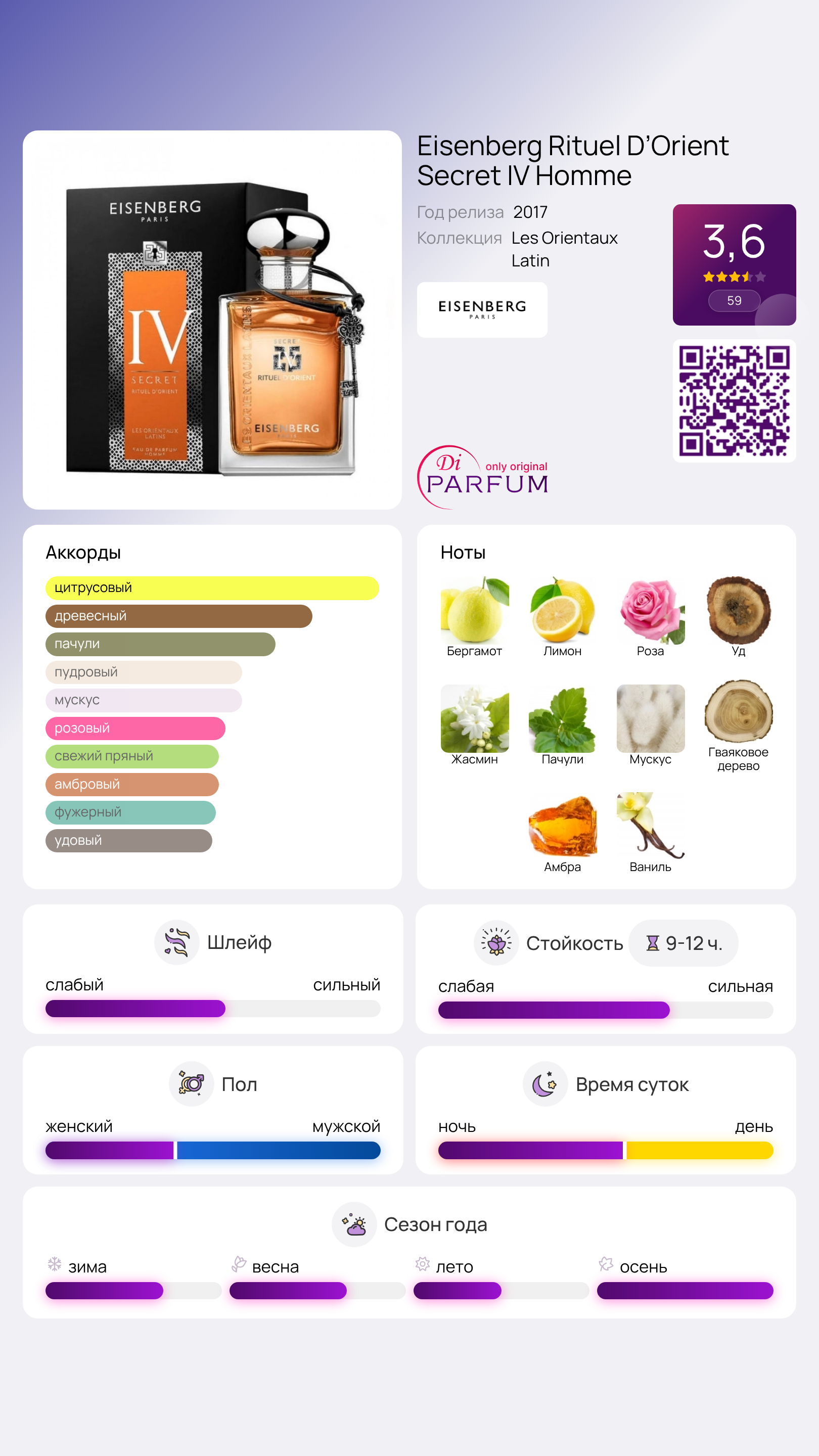 В его верхних нотах доминирует лимон, при этом бергамот звучит значительно менее уверенно. На средних нотах уд и жасмин активно соперничают за внимание деликатной розы, но самый интригующий момент начинается в базе: тут ваниль, пачули и гуаяк начинают ярко сочетаться, внося в композицию мускус и амбру. Женская аудитория, несомненно, оценит этот аромат, так как он отличается гармоничностью, мягкостью и притягательной сладостью.