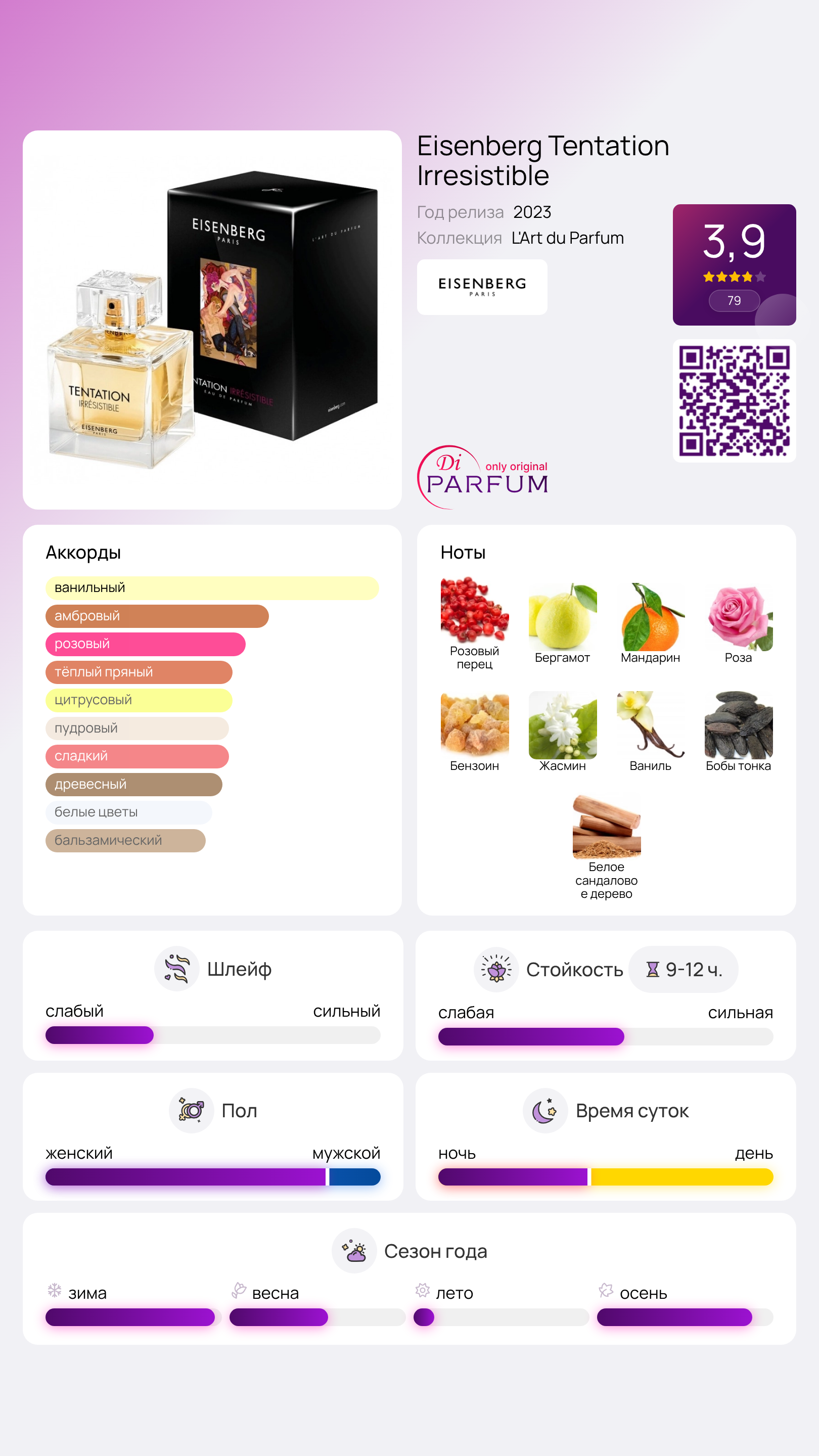 В шлейфе аромата ощущаются гурманские оттенки: сливочный сандал, мягкая ваниль и дымные бобы тонка. Чувственный Irresistible от Eisenberg Tentation ассоциируется с фиолетовыми и розовыми цветами на работах Juarez Machado, создавая впечатление неотразимого соблазна. Этот парфюм был выпущен французским брендом в 2023 году в качестве фланкера к успешному Tentation, представленному в 2010 году.
