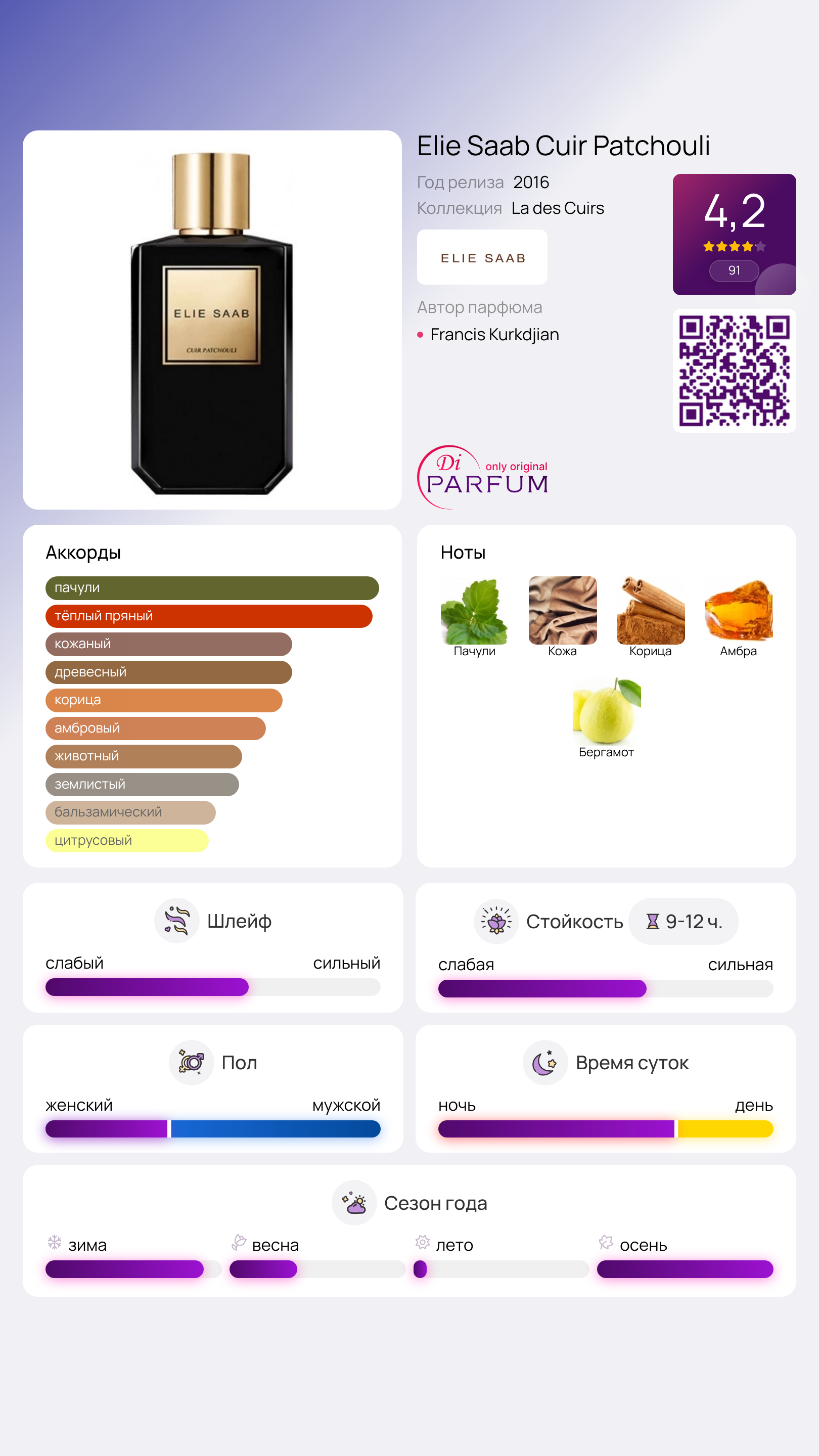 Центральная нота этого аромата подчеркнута пачули с его многообразным и глубоким звучанием. В Cuir Patchouli присутствуют все нюансы этого компонента – от влажных и землистых до теплых шоколадных оттенков. Пачули и кожа окружены гармоничным сочетанием бергамота, корицы и амбры, что создает изысканный и запоминающийся аромат.