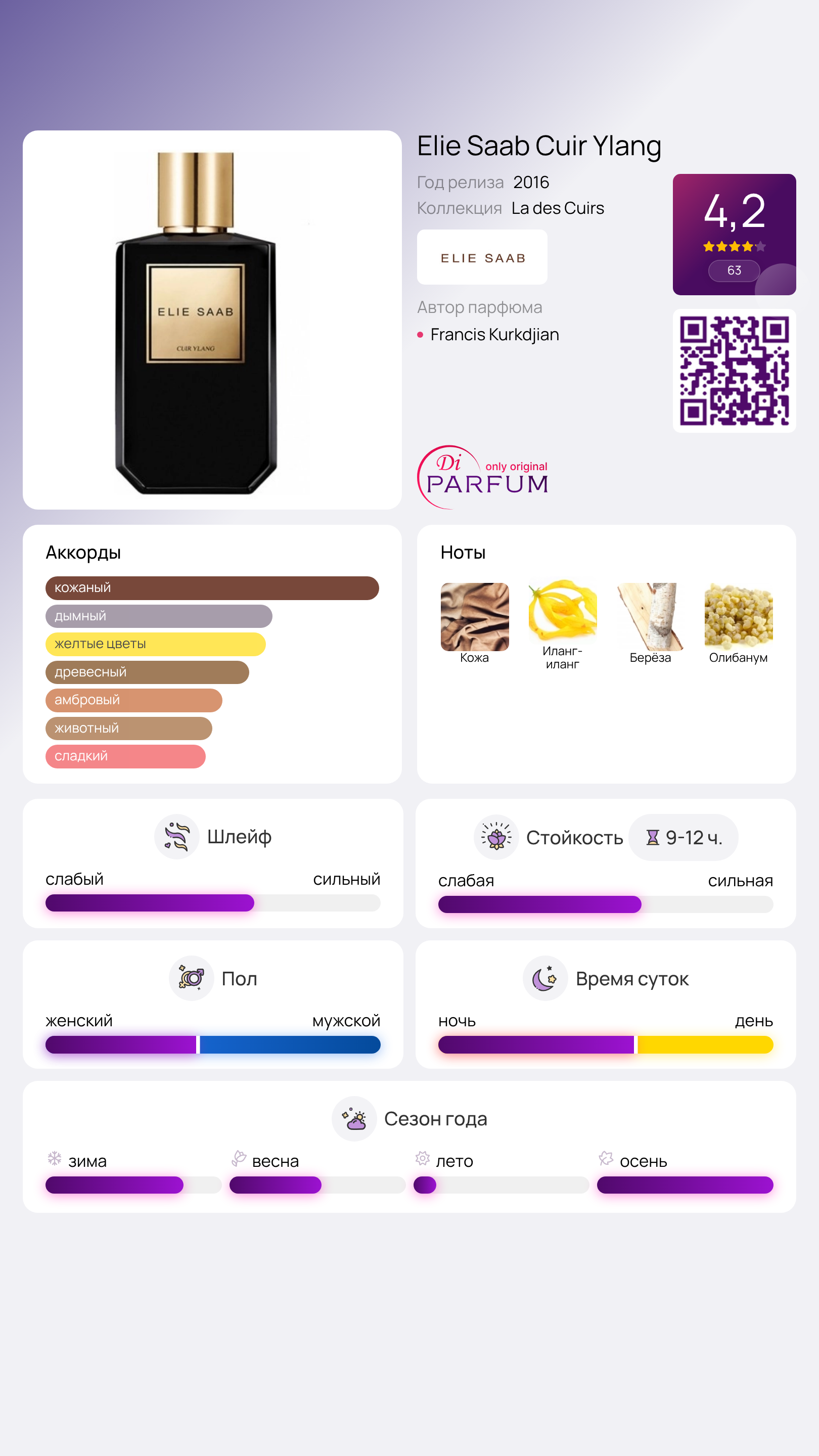 Парфюмерные творения бренда Elie Saab всегда привлекают особое внимание, особенно учитывая участие самых талантливых парфюмеров мира в их создании. Один из таких ароматов — Cuir Ylang, входящий в коллекцию Cuir Absolu, был разработан известным парфюмером Francis Kurkdjian.