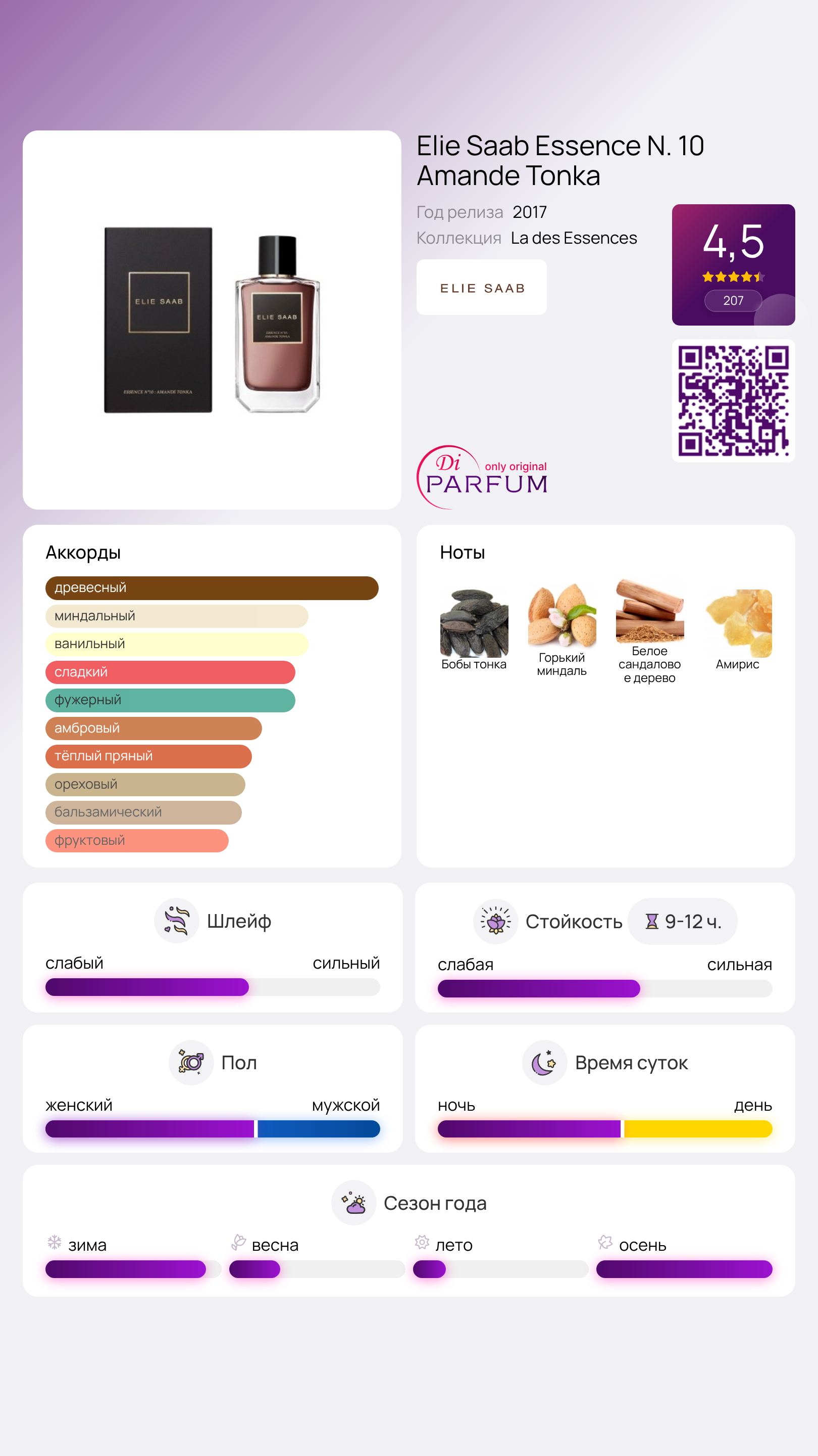 Одним из парфюмерных новшеств 2017 года от Elie Saab стала унисексовая композиция Essence N. 10 Amande Tonka. Это творение популярного парфюмера Francis Kurkdjian украсило коллекцию La Collection des Essences бренда.