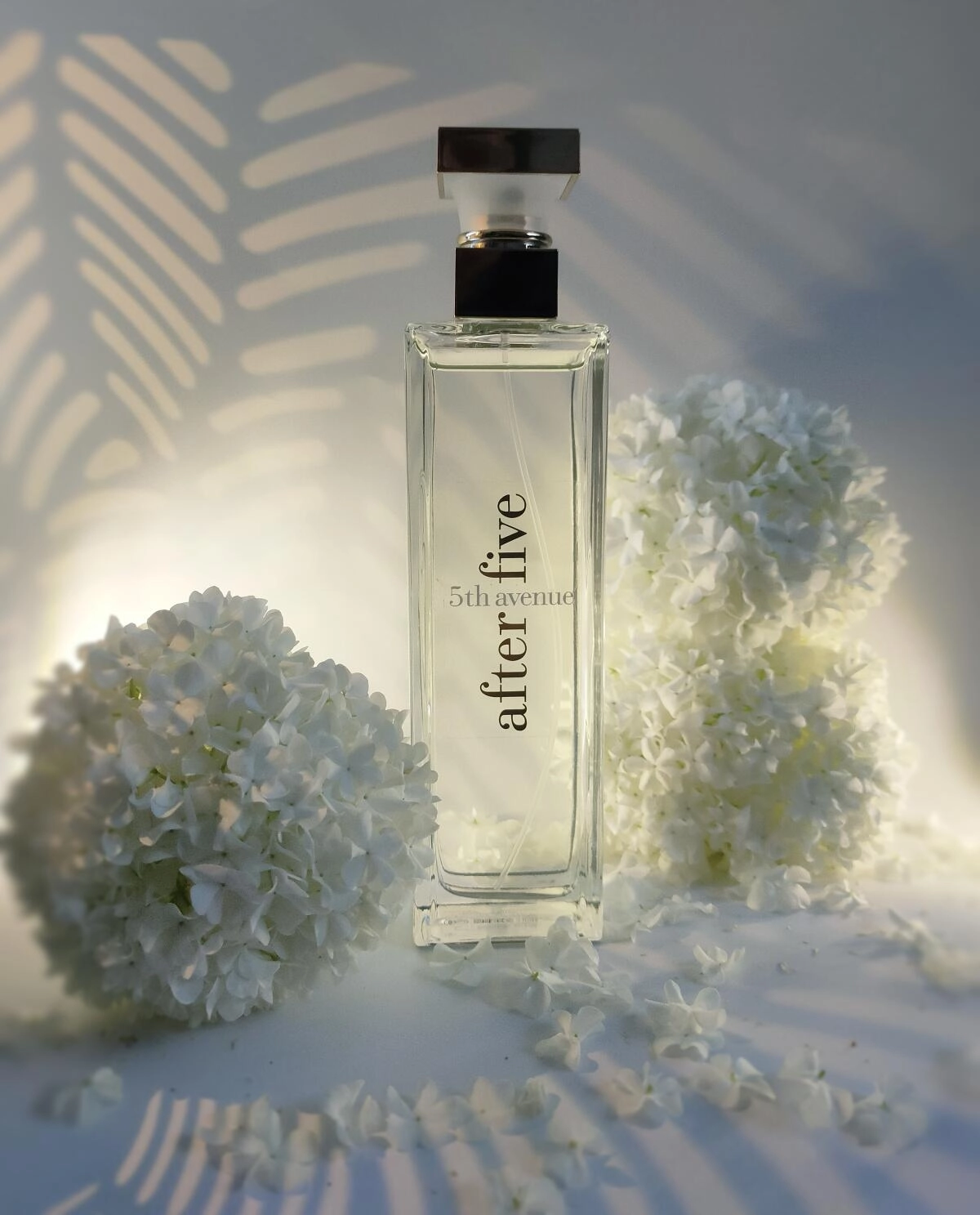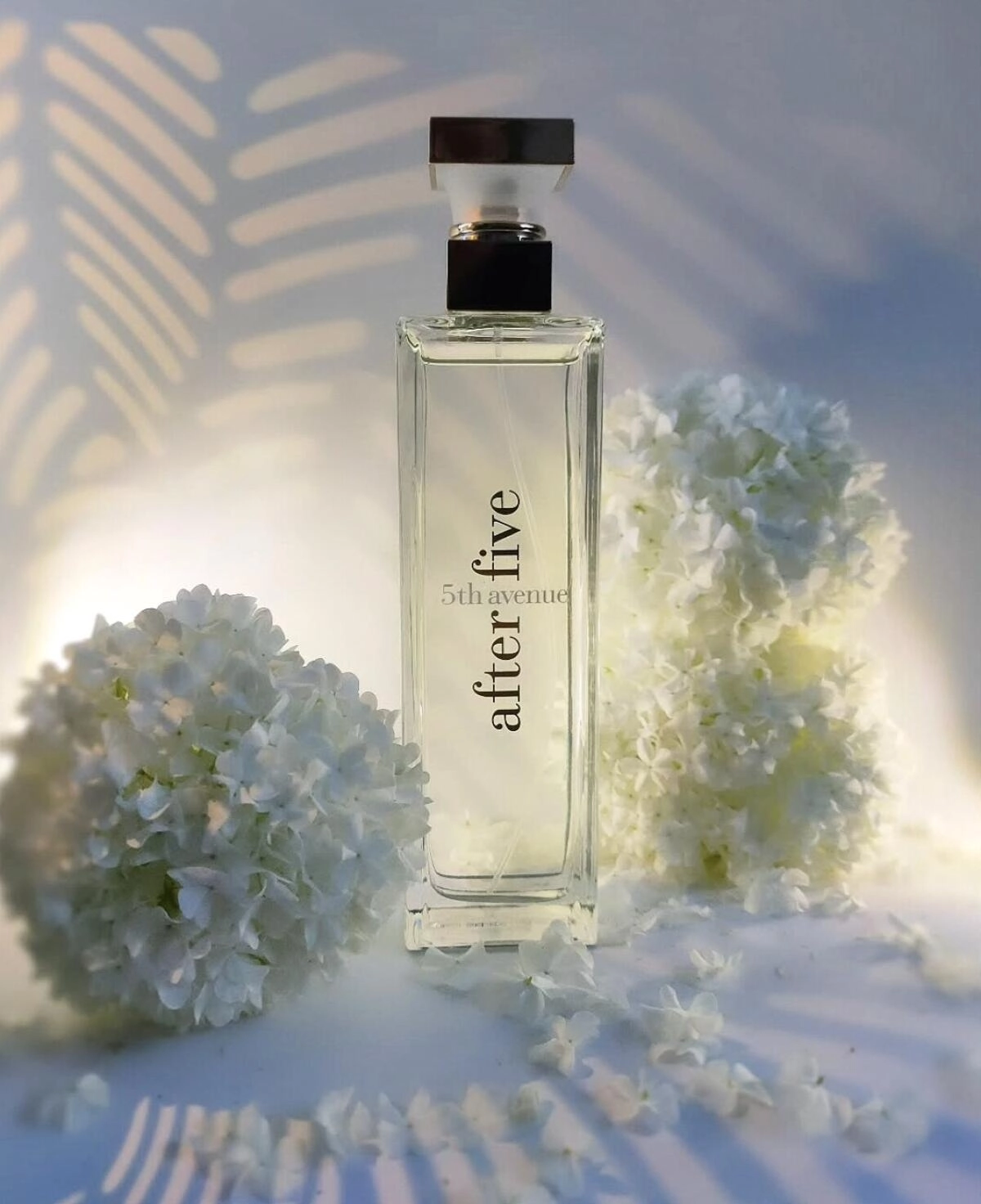 В верхних нотах можно обнаружить зрелую черную сливу, бергамот и кориандр, которые идеально дополняются нежным золотистым оттенком жимолости. В сочетании с прохладой ландыша и жасмина самбак, а также шафраном и цветком индийского лотоса, создаётся неповторимая композиция. Завершающий аккорд заключен в шлейфе кремового сандалового дерева, белой березы, бобов тонка и мускуса. 5th Avenue After Five создает атмосферу ожидания романтического вечера.
