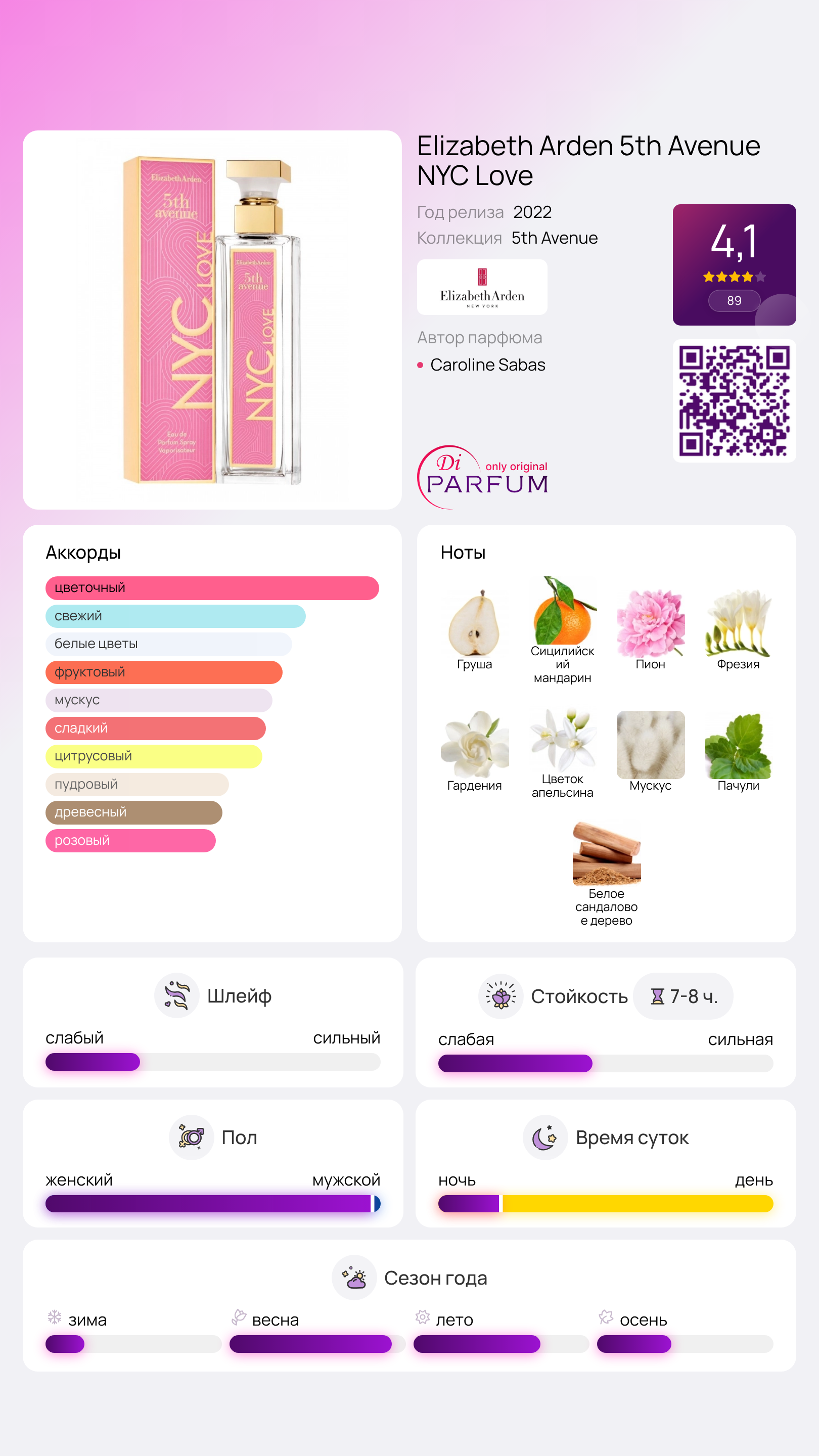 Аромат Elizabeth Arden 5th Avenue NYC Love представляет собой захватывающую цветочно-фруктовую композицию, посвященную теме любви. Он наполняет сердца радостью и дарит незабываемые эмоции, создавая атмосферу, которая обволакивает и вдохновляет.