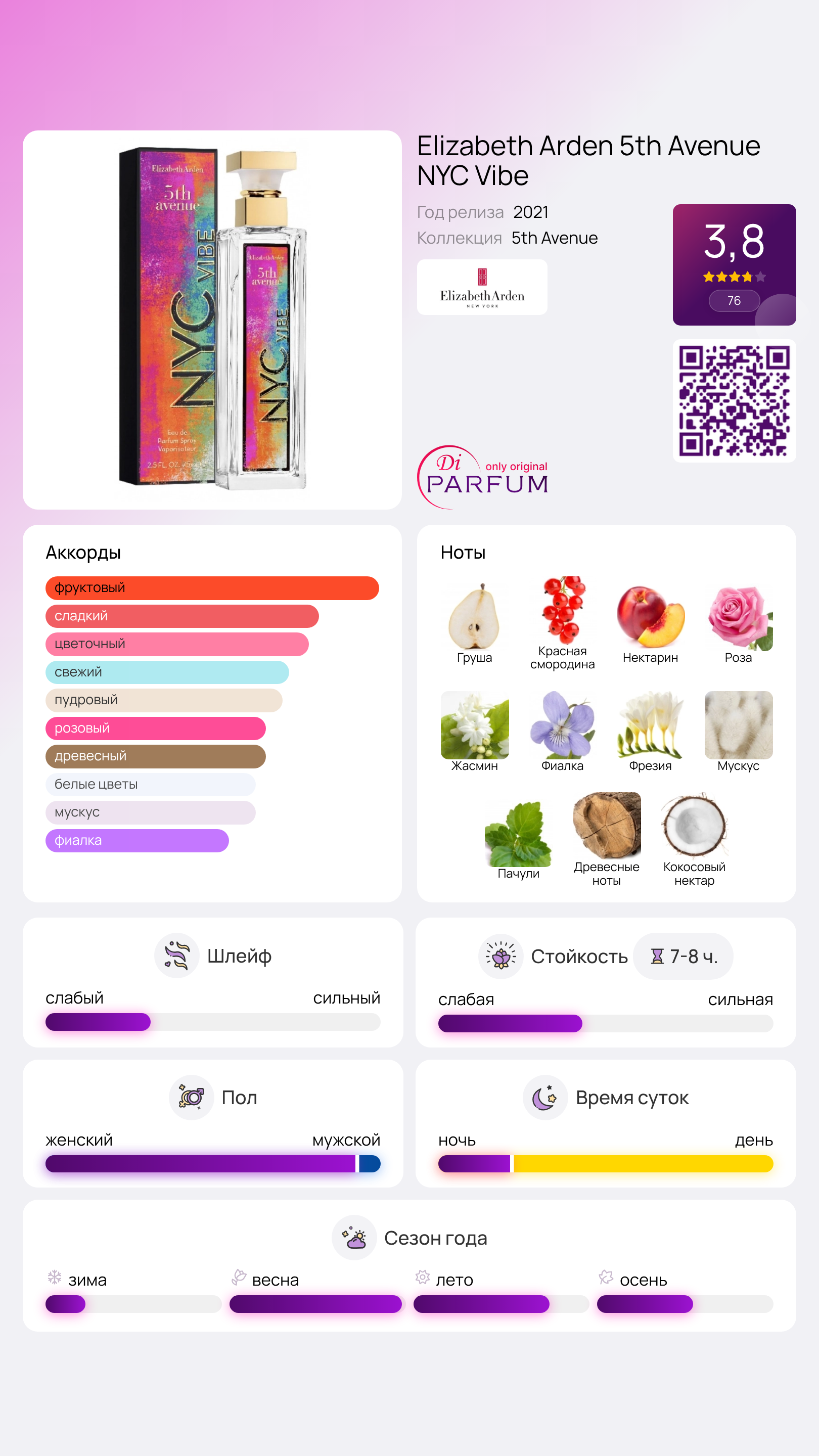 Вдохновленный яркими огнями Пятой авеню, где шик гармонирует с городской атмосферой, парфюм Elizabeth Arden 5th Avenue NYC Vibe передает суть современной городской женщины. Этот аромат — настоящая ода энергии Нью-Йорка, воплощенная в живой цветочно-древесной смеси. Он предназначен для активных и уверенных в себе женщин, которые, как и сам город, всегда в движении. Знаменитый американский бренд Elizabeth Arden продолжает свою культовую линию 5th Avenue, где каждый аромат отражает уникальность различных районов мегаполиса.