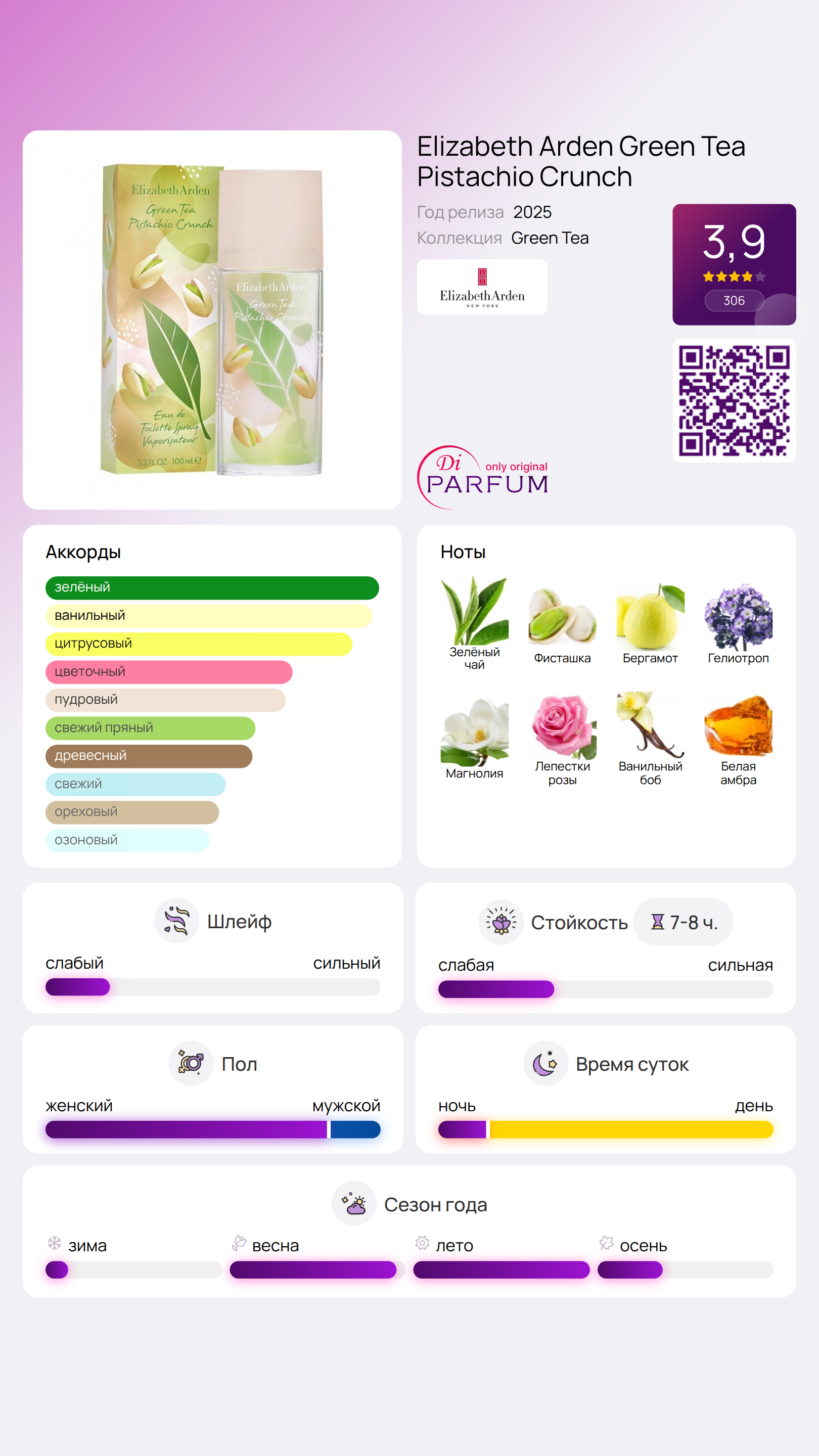Завершают аромат тёплые и уютные базовые ноты ванильной бобы и белой амбры, которые придают завершенность и глубокую насыщенность. Green Tea Pistachio Crunch — это идеальный выбор для тех, кто ценит свежесть, уют и мягкость в парфюмерии.