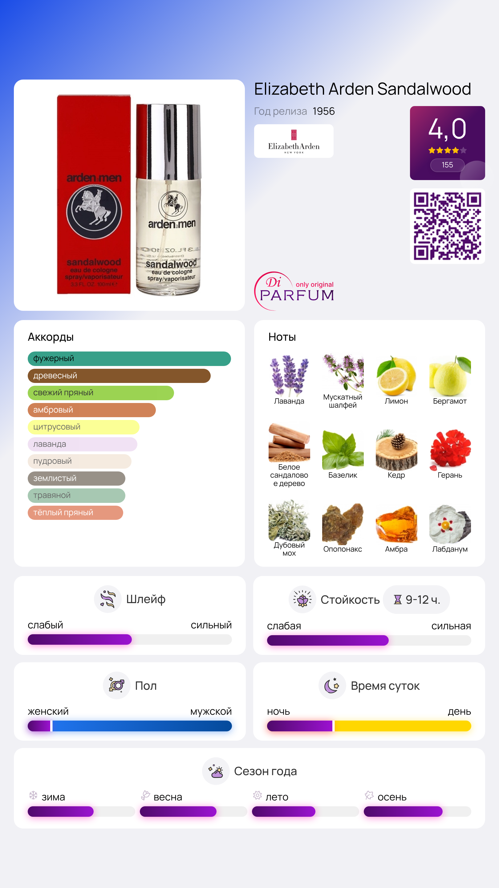 Парфюм Sandal Wood, созданный домом Elizabeth Arden, имеет богатую историю, насчитывающую более 50 лет. На протяжении этого времени он стал символом качества, известным и ценимым среди мужчин, благодаря своей утонченности и элегантности.