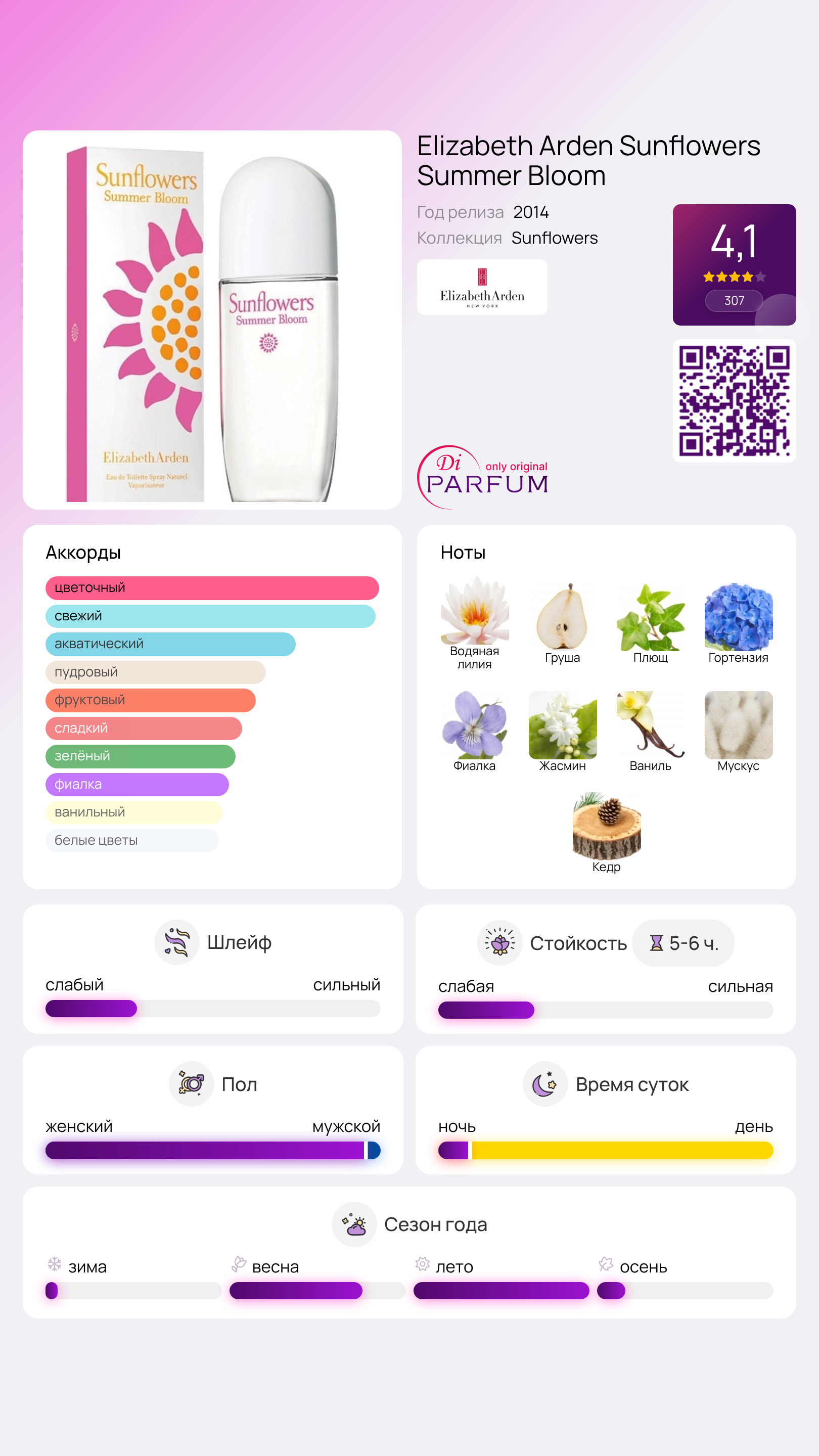 Парфюм Sunflowers Summer Bloom переносит вас в тропическую атмосферу жаркого летнего дня, когда все цвета становятся особенно насыщенными. Начальные ноты аромата сочетают в себе груши, водяные лилии и плющ.