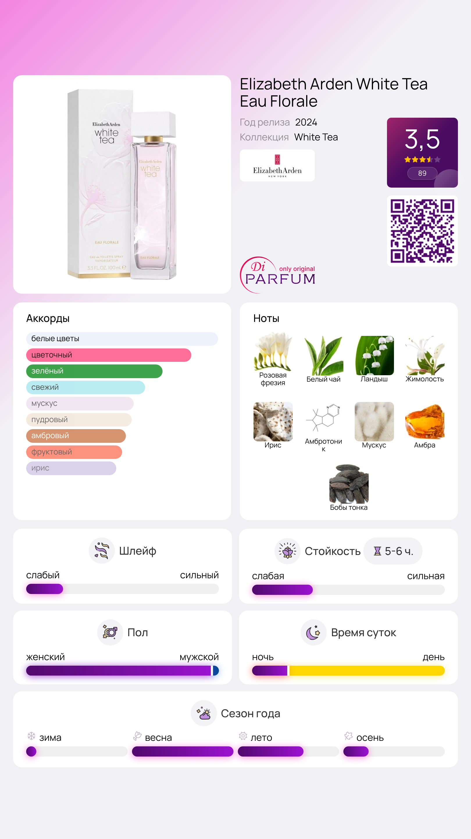 White Tea Eau Florale – это аромат для тех, кто ценит естественную красоту, которую дарит природа. Он наслаждает гармонией и спокойствием, открывая новые грани привычного, что окружает нас повседневно. Аромат от Elizabeth Arden напоминает, что истинная красота всегда в глазах смотрящего.