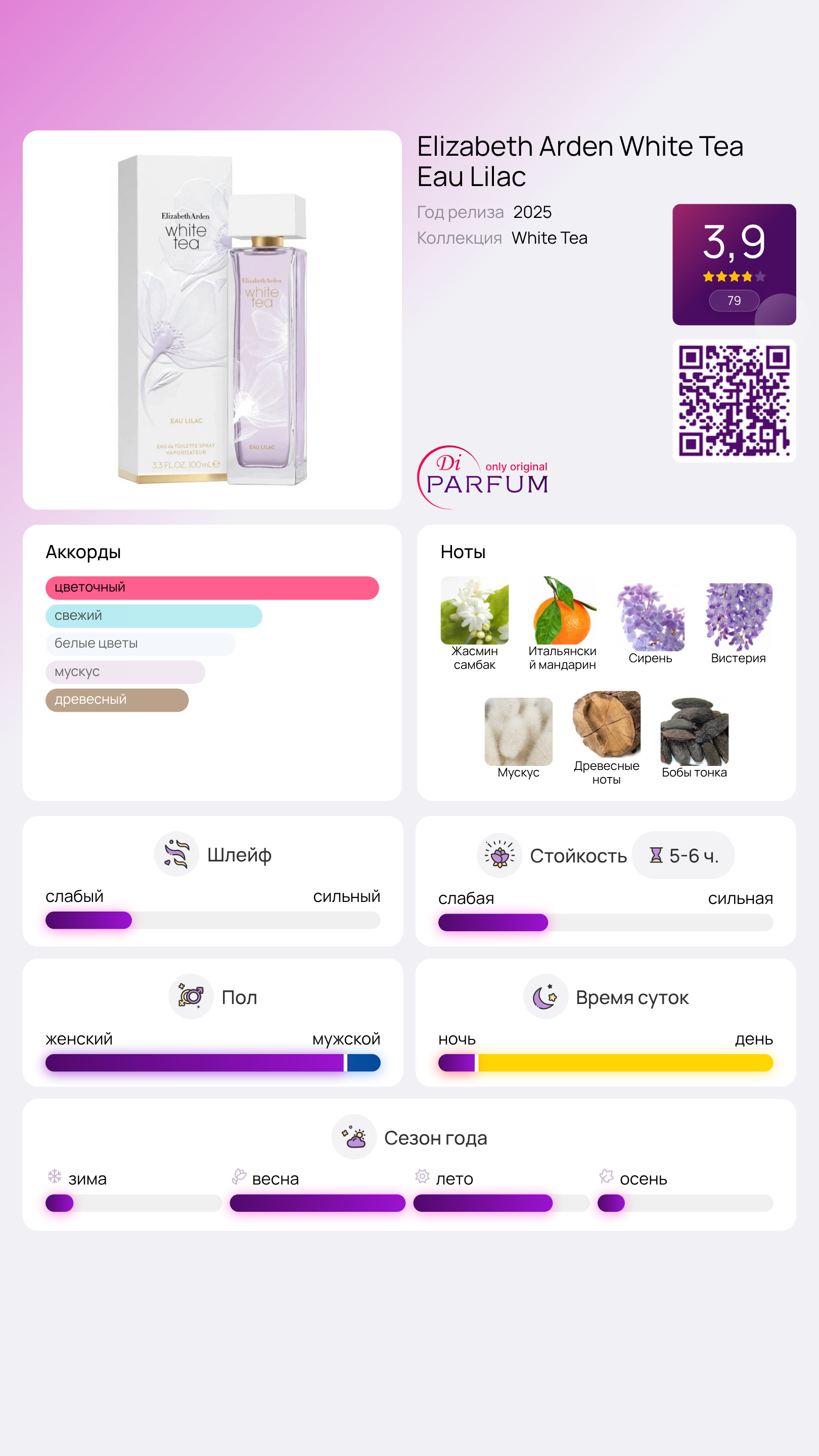 White Tea Eau Lilac от Elizabeth Arden – это новый цветочно-древесный мускусный аромат для женщин, который был запущен в 2025 году. Это тонкий и изысканный парфюм, идеально подходящий для весеннего и летнего сезонов, когда женщины стремятся подчеркнуть свою женственность и очарование.