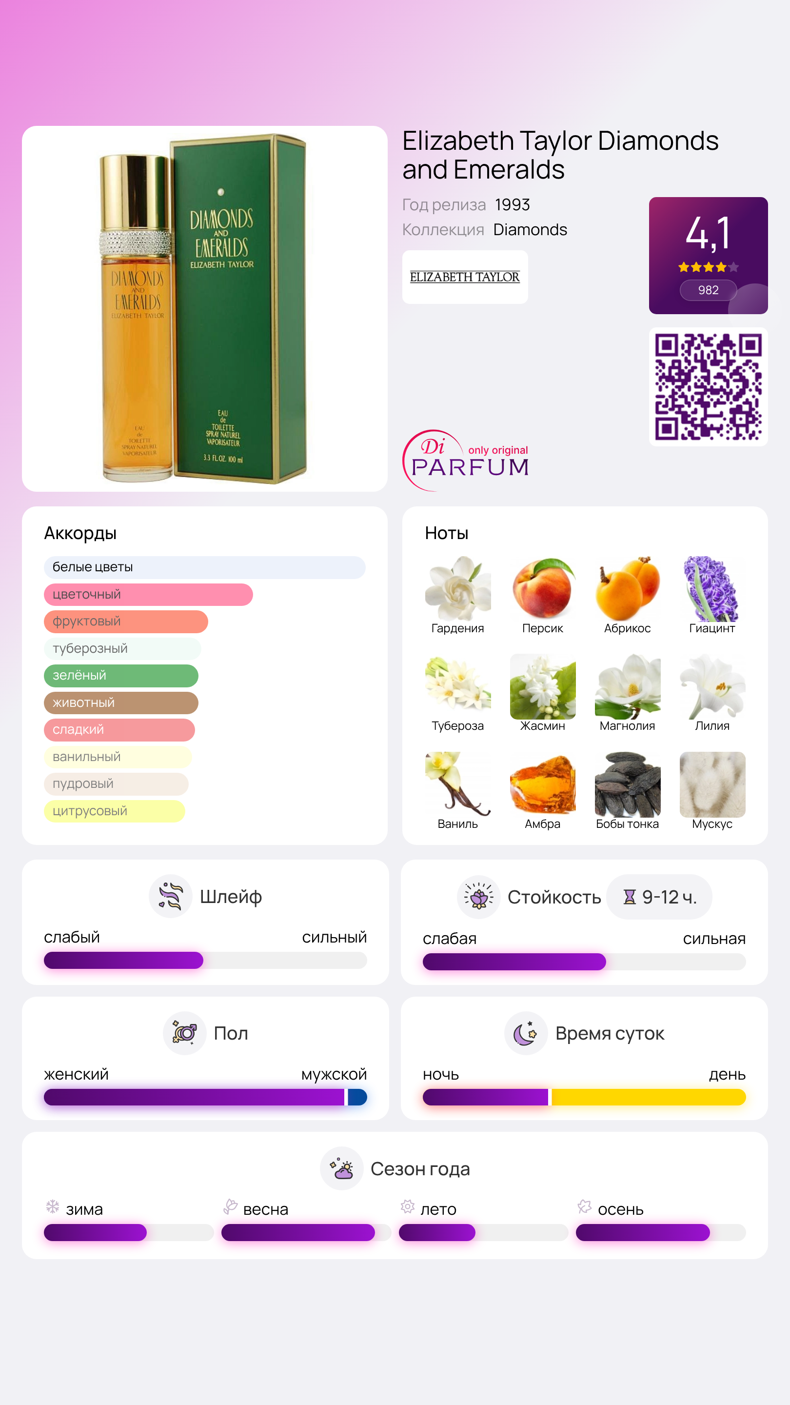 Аромат Diamonds and Emeralds от американского дома Elizabeth Taylor представляет собой цветочную композицию с явным восточным характером, что становится очевидным благодаря его сложной и многослойной структуре.
