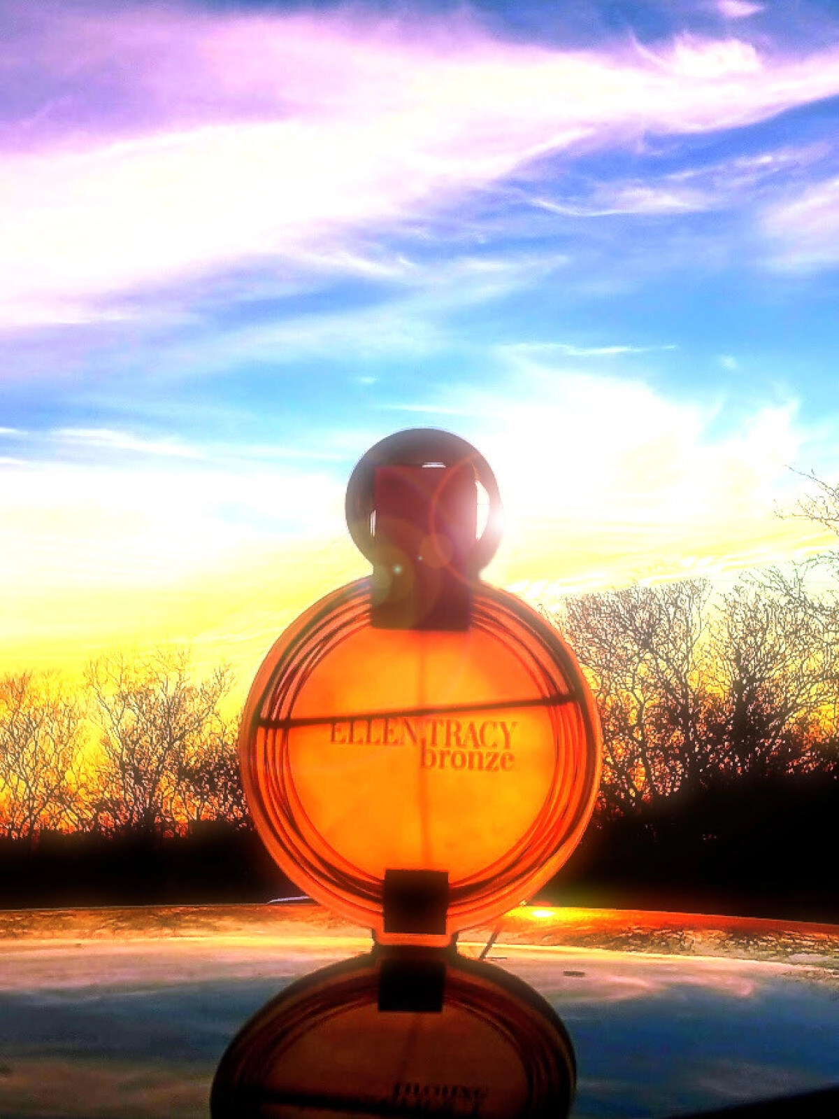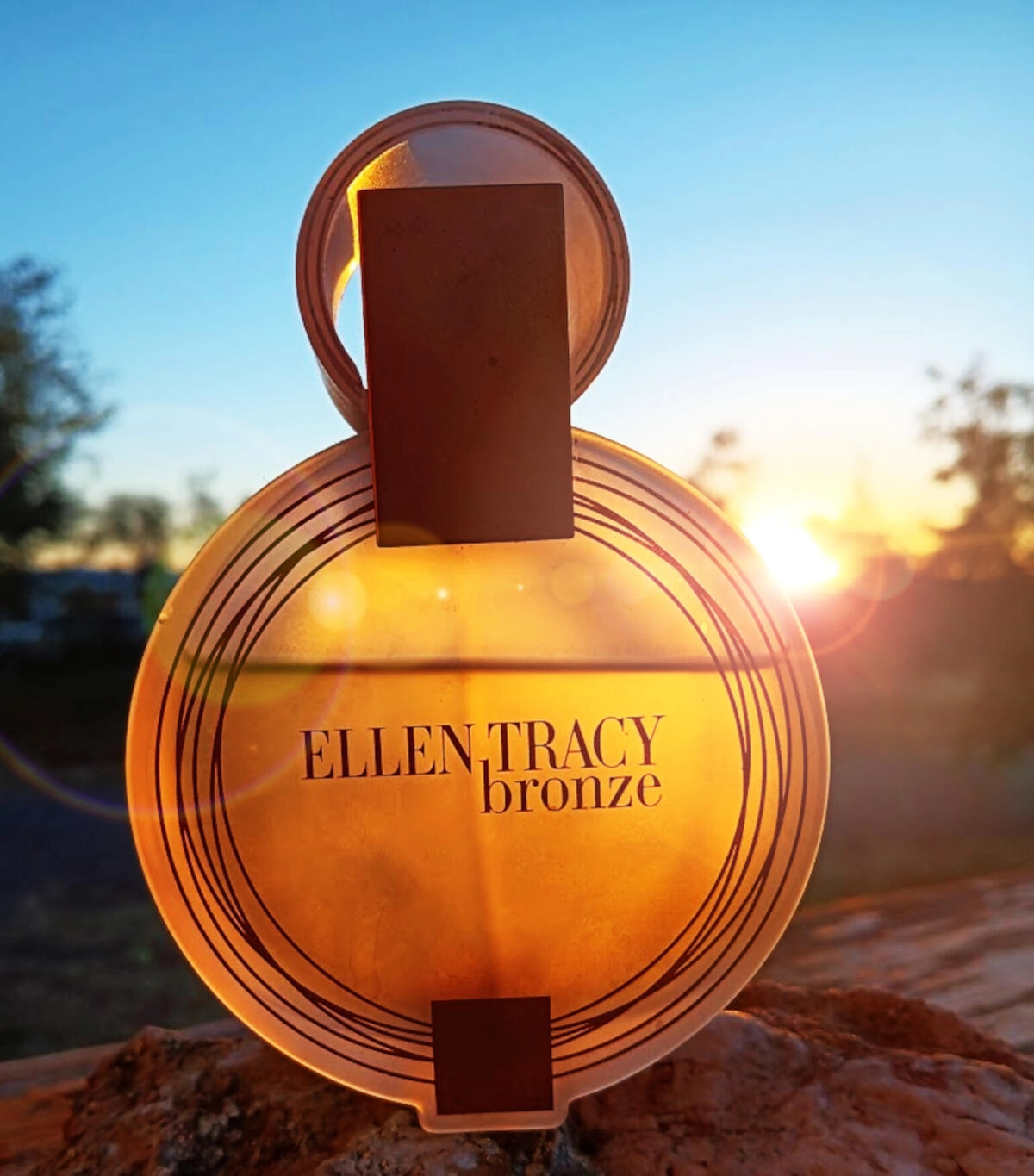Круглая флакончик Ellen Tracy Bronze украшен металлическими деталями, что подчеркивает «бронзовый» характер аромата.