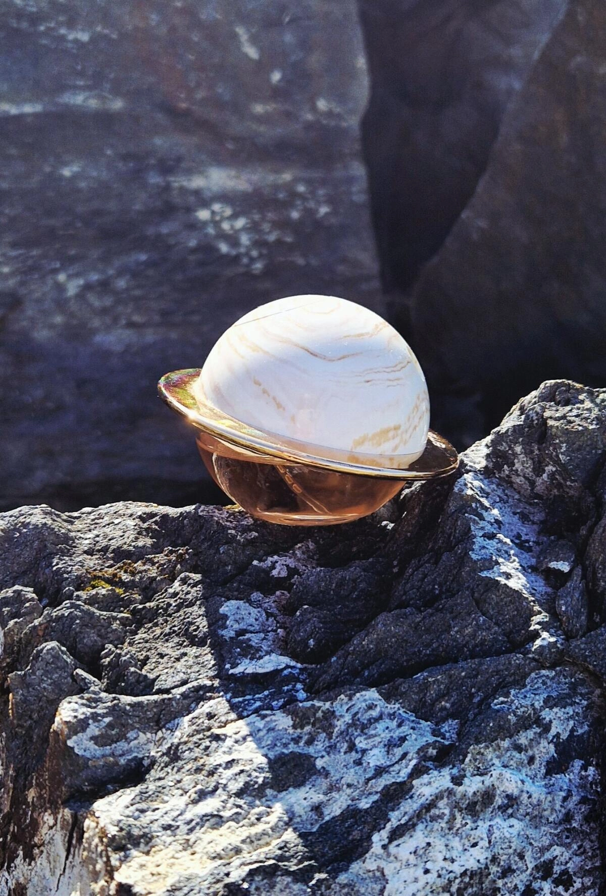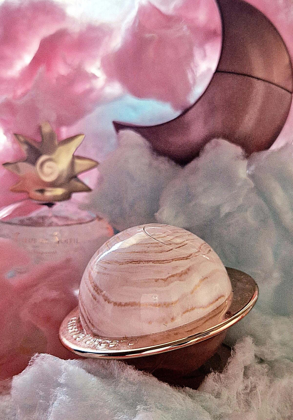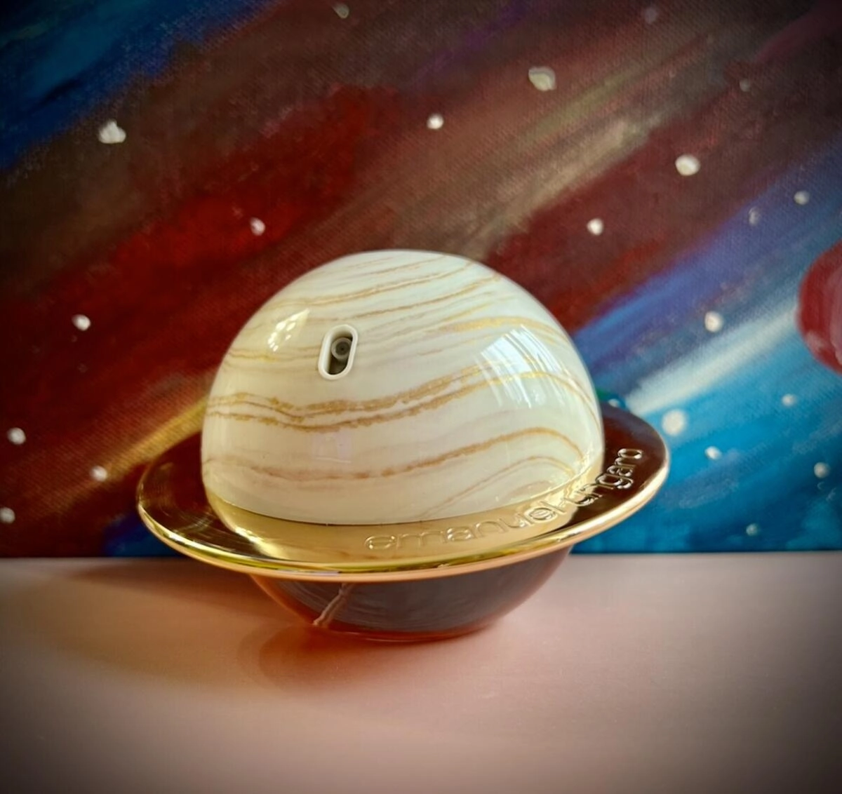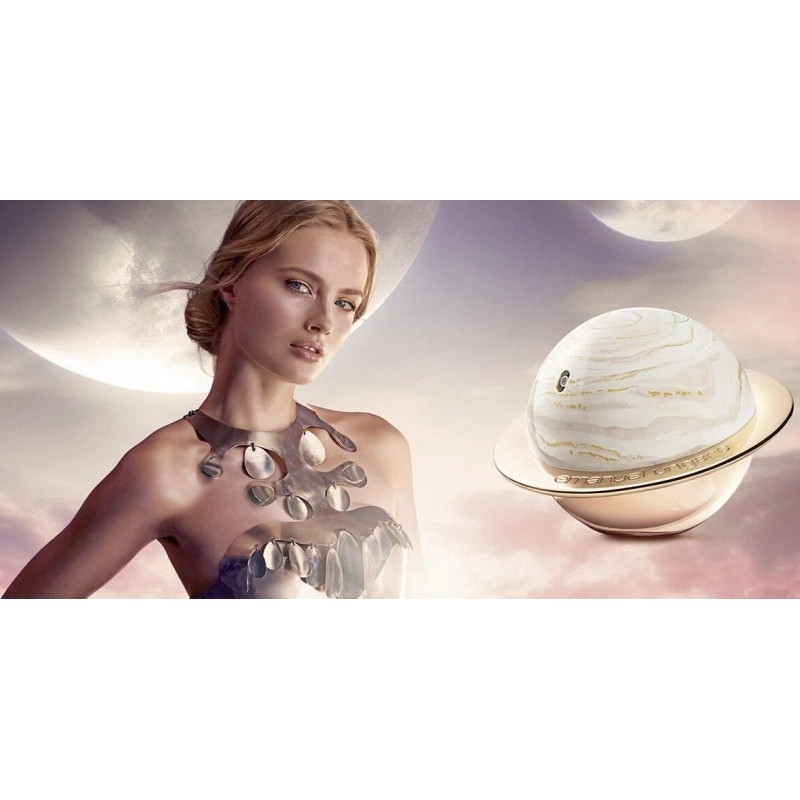 Дизайн флакона вдохновлен футуристической модой "Космической эры" 1960-х годов. Флакон имеет форму планеты с элегантно встроенной крышкой. Мраморные узоры и роскошное золотое кольцо подчеркивают его статус как современного и престижного творения. Упаковка также отражает кремовые мраморные узоры с металлической линзой в центре.