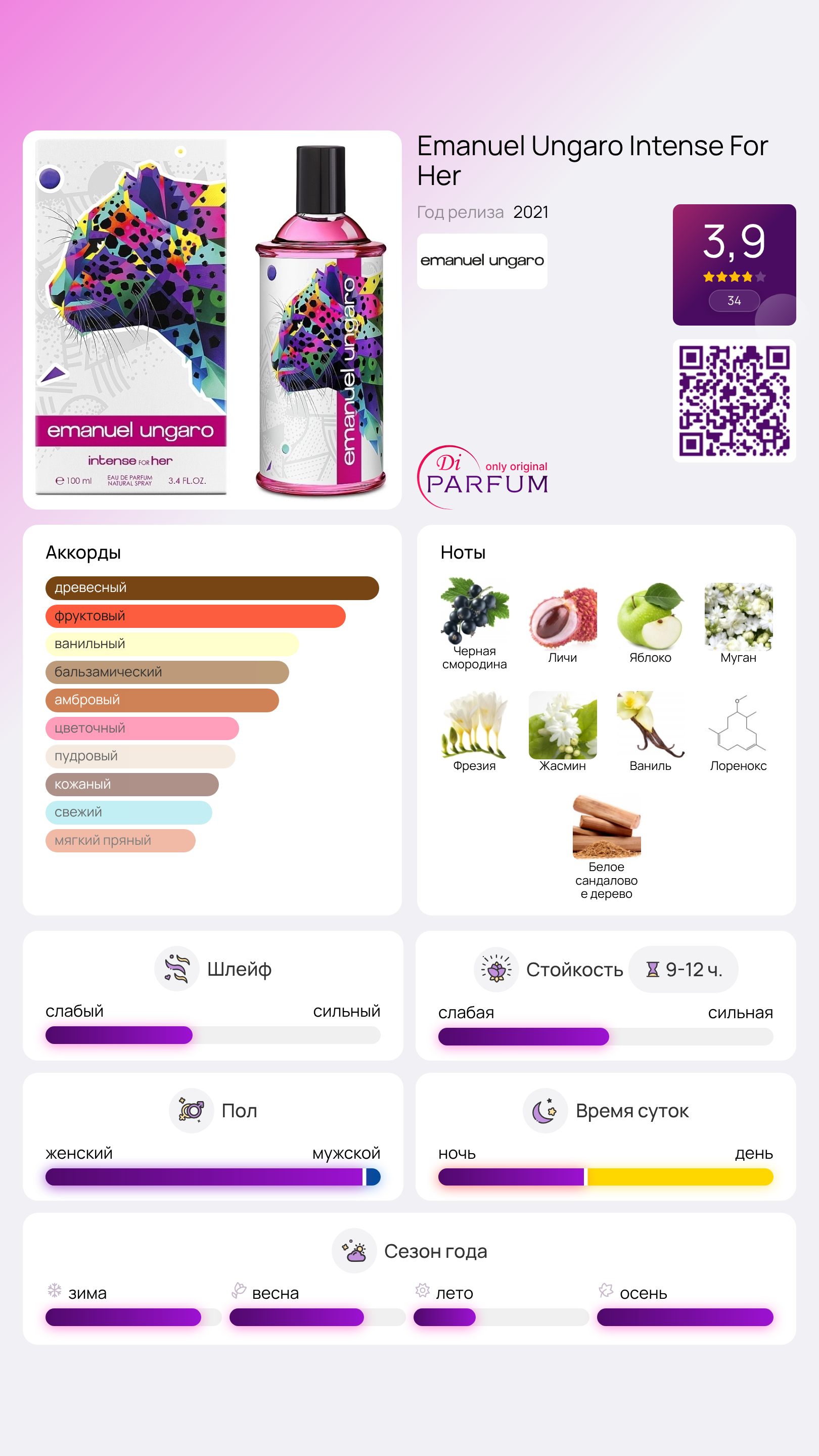 Привлекательная цветочно-фруктовая композиция Emanuel Ungaro Intense For Her представляет собой уникальное сочетание ярких и насыщенных ароматов, которые отражают радостную и самобытную красоту природы. Этот аромат олицетворяет подлинную Женственность и подходит женщине, создающей свой стиль, смело нарушая нормы.