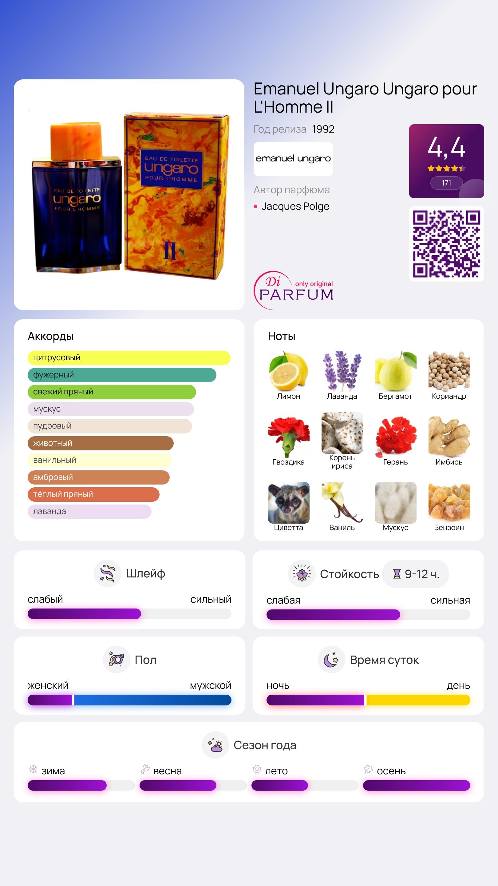 Основатель бренда Emanuel Ungaro начал свою профессиональную жизнь как модельер, а позже переключился на создание роскошной парфюмерии, в чем весьма преуспел. Парфюм Ungaro II относится к восточной пряной категории.