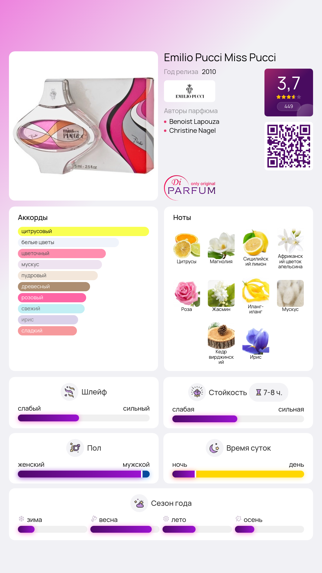 Emilio Pucci черпает идеи из ретро-стиля, обращая внимание на его утонченное очарование и элегантность. Интегрируя это деликатное волшебство прошедшего времени в современность, бренд представляет живописное творение, именуемое Miss Pucci. Аромат запечатлен в оригинальном флаконе, оформленном традиционным цветным принтом Pucci в трехмерной интерпретации. Дизайнер Ора Ито стремится передать невидимую нить, соединяющую традицию с современностью, что можно назвать калейдоскопом жизни.